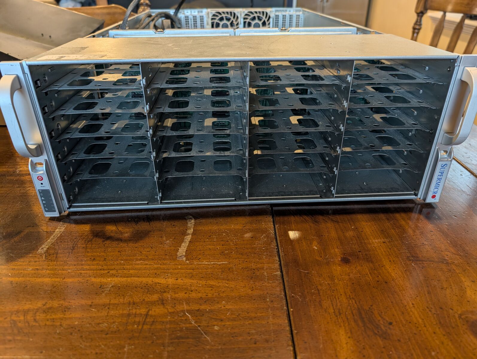 This was my Plex server for years. It never gave me a day of trouble. I simply upgraded last year and it's time to make room. It has space for up to 24 hard drives. You'll need to buy some Supermicro disk caddies but those are very cheap on ebay. You'll also need hard drives. Unraid will let you take all your old hard drives you have laying around the house and use them all at once to get started. I couldn't get the video working but you don't need it since it's intended for remote use. There is a basic video card in it that you can have. If you install Unraid on it, it will let you choose the IP address from which you can access the control interface. (Unraid is installed and ran from a thumbdrive. USB 2.0 is recommended) It is kinda loud as servers are. This is best in a dedicated space or in a garage. Comes with 2 working power supplies. All the hard drive spaces are connected to the motherboard with HBA cards and the backplane.