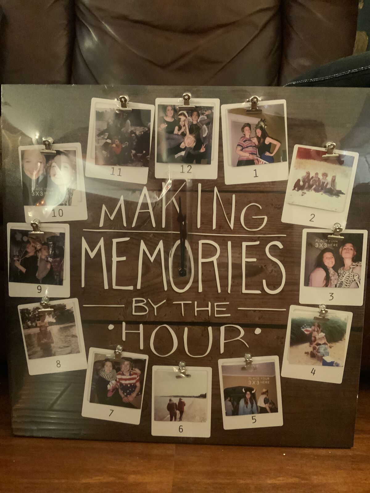 PayPalBrand new, "Making Memories by the Hour" wall clock, way cute!, resembles Polaroid photos with clips where you just put up your own pictures, the photos are 3" x 3" and the frame itself is 20"x 20", real clock that takes a AA battery, ready to hang, asking $19.95, contact by text only please and pick up in Bountiful