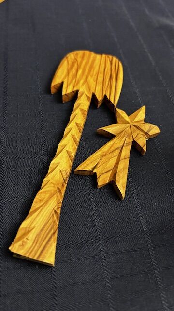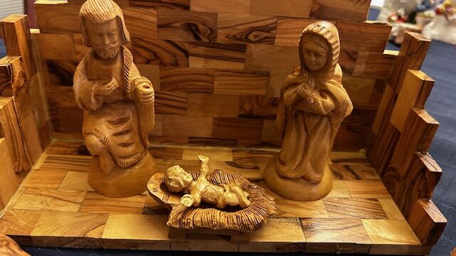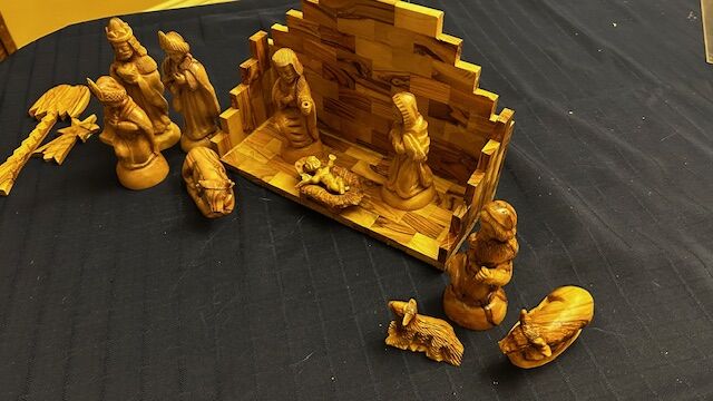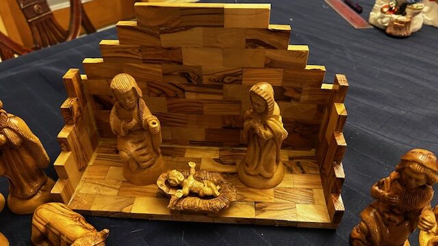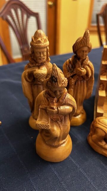This is a fabulous Beautiful variegated wood Nativity complete set - lovely collectible creche set - manger background is 10.5" long x "4.25 deep x 7" tall. 14 pieces. Tallest figure is 5.75" tall. Figures are extremely detailed. Includes 3 wisemen, a star (needs to be glued back on backdrop), palm tree (also needs to be glued back on the backdrop), Joseph and Mary, Sheperd (Joseph and Sheperd both have an open hole in their hand for a shepherd staff but both shepherd staffs need to be replaced), 3 animals, manger, and baby Jesus. Wood is a beautiful two-toned grained, smooth and glossy wood. Cash only at pick up in Highland, UT
