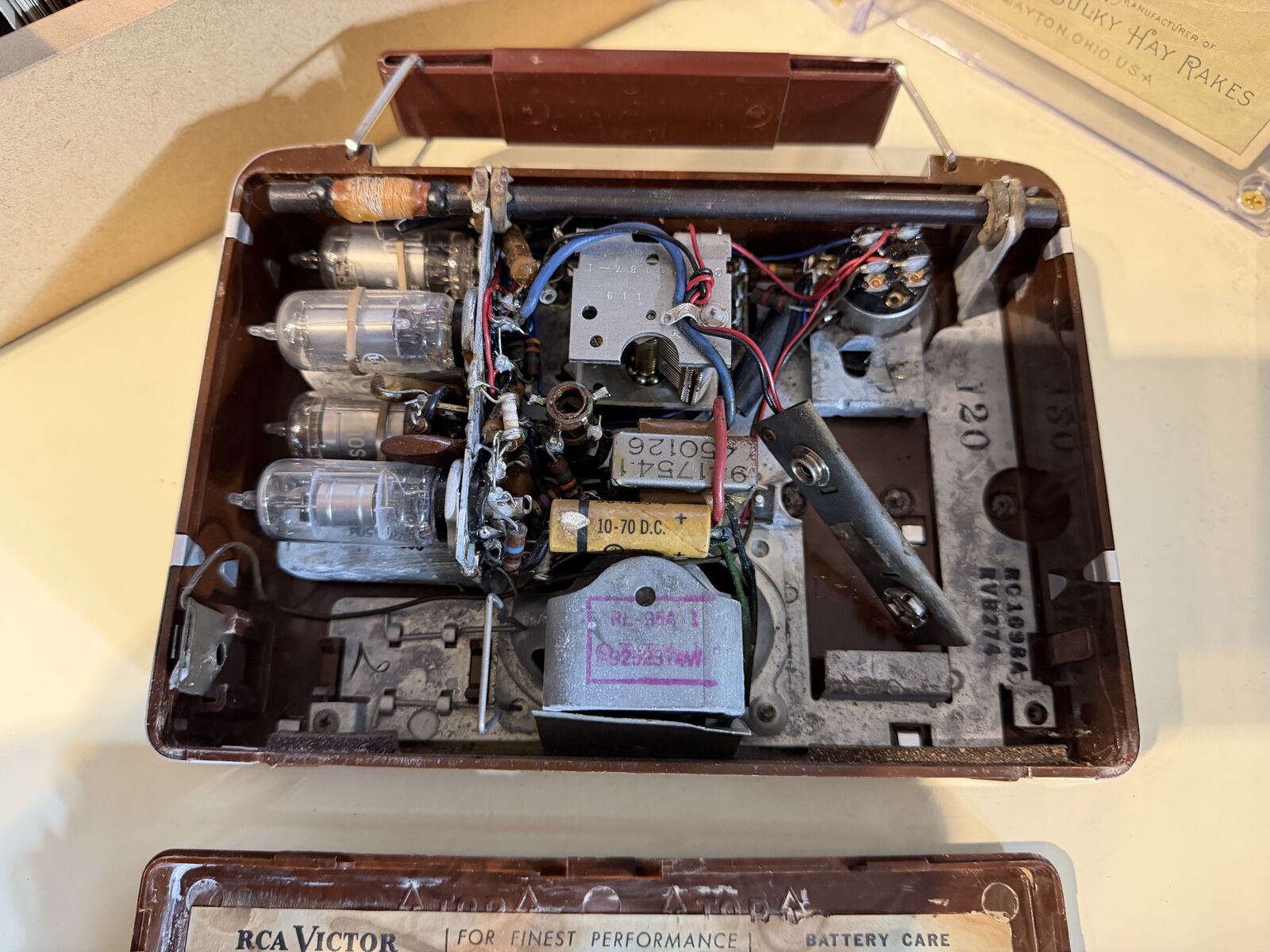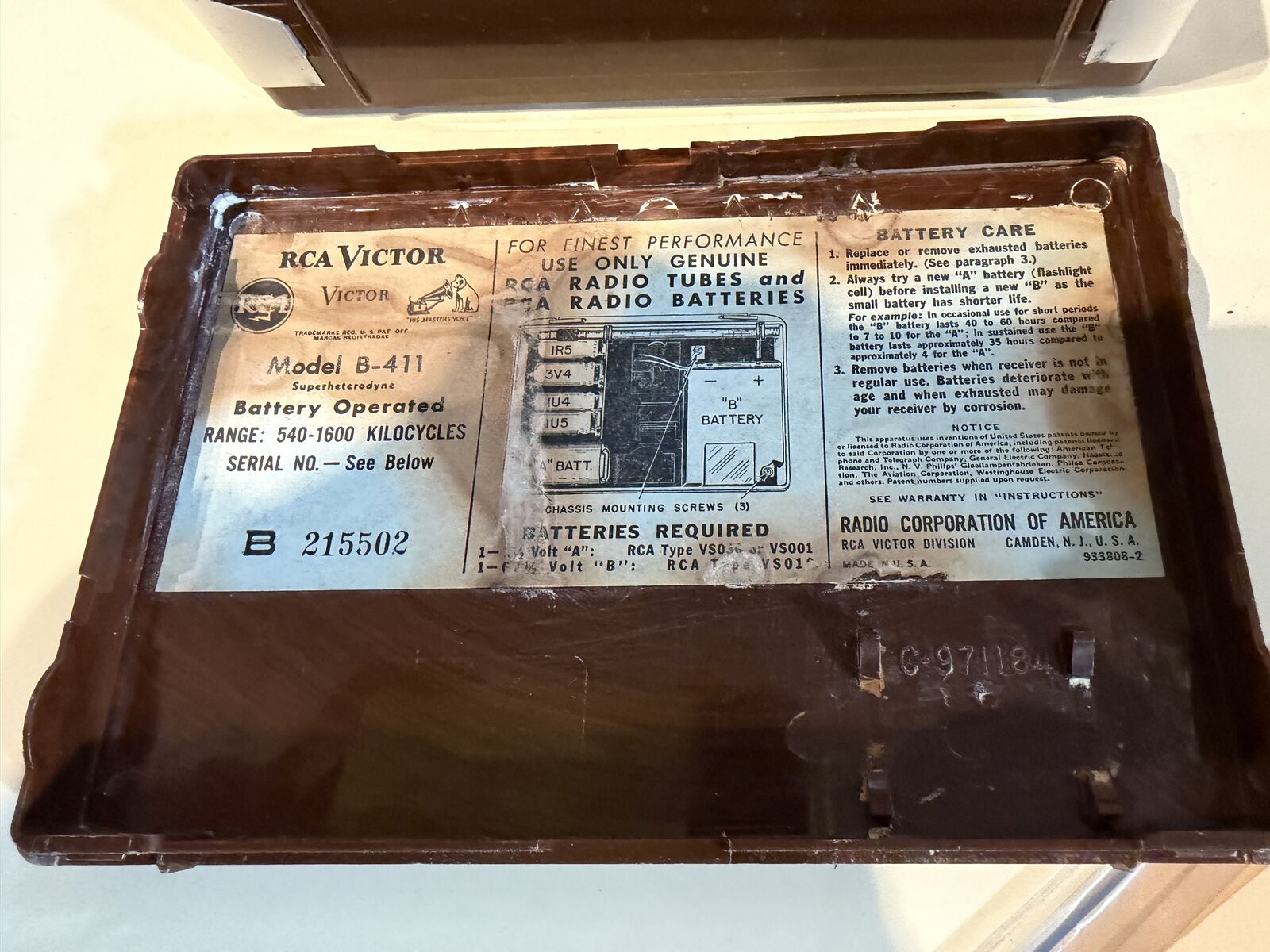 A striking example of Atomic-era design, this vintage RCA Victor B-411 portable tube radio dates to the 1950s and showcases the bold curves and confident styling that define true Mid-Century Modern aesthetics. With its sculptural form, classic dial, and compact tabletop scale, this piece makes an eye-catching accent for a credenza, bookshelf, desk, or styled vignette.