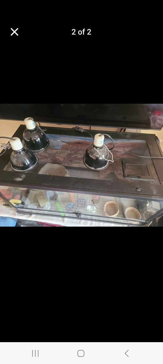 PayPal50 gallon front opening front opening reptile habitat with light fixtures and bulbs, a ceramic heat bulb, cave hide, food dishes, water pool, scoop for use with sand substrate, slanted basking rock, mat heater attached to the side, more accessories specific to beardies if wanted as well. 250.00