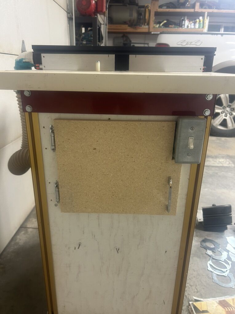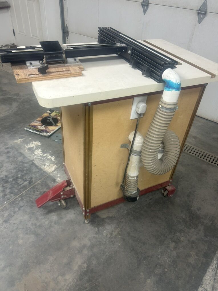 The router table is 24 x 36 incra. The stand and casters are also incra. I enclosed the stand to make it more usable. 2 drawers for router bits 1 for 1/4 and 1 for 1/2. Router bits in the pictures are not included. The router plate is incra with the whole set of magna lock rings. It comes with a Bosch 1316 eve plunge router with micro adjust knob. The fence is jointech it is almost identical to incra. It has the book with all the templates to make about any joint you want. Dust collection on the fence and router cabinet. There is push ficture the attach to the fence. 1/4 and 1/2 collets. Wrench and original base included.