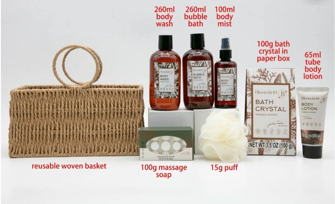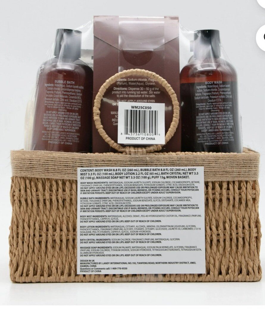 Zellebath set woven basket with bubble bath, soap bar, bath salt, body mist, lotion and scrub puff. Scent is very nice and wonderful for female or Male. Makes a great gift