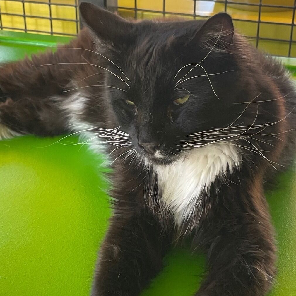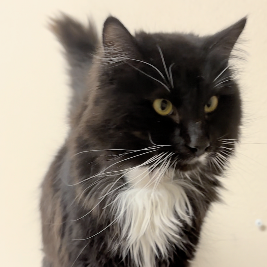 Meet Sam, the fluffy tuxedo cat who knows he's got the looks to turn heads. With his sleek black-and-white coat and a tail that swishes with pride, Sam is always ready to flaunt his charm. He loves to soak up all the pets and affection, often rolling over to show his belly and invite endless belly rubs. With his playful personality and confidence, Sam is the ultimate attention seeker and a true snuggle pro.
