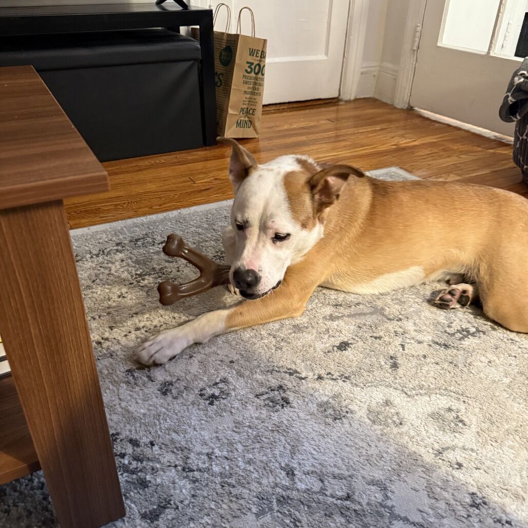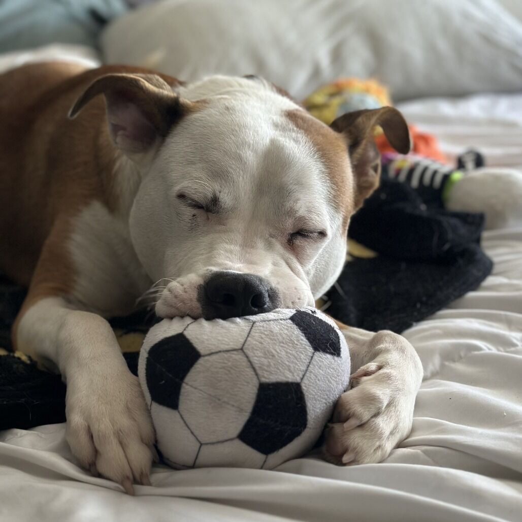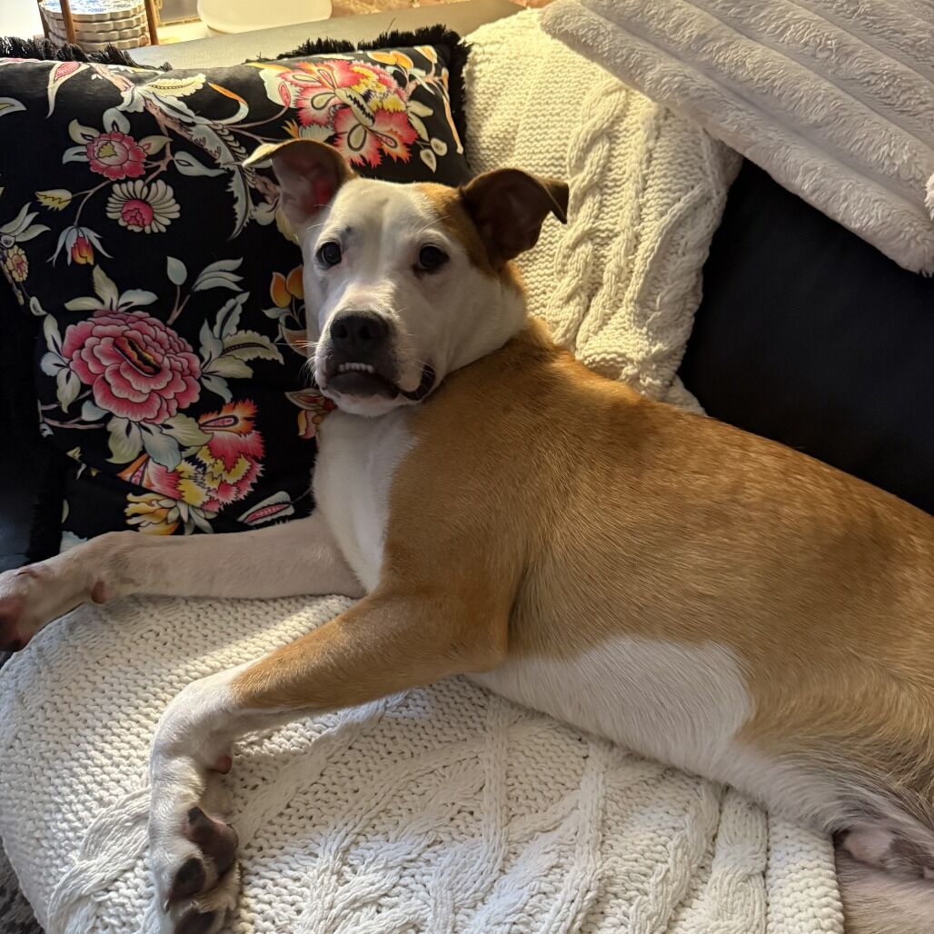Meet Axl — professional goofball and full-time heart stealer. Axel’s signature look? A charming underbite and an expression that looks like he’s always in on a joke. One glance at that face and you’re done for. He’s sweet, silly, and proudly lives life upside down—literally. Whether it’s the bed or the couch, Axel’s favorite lounging position is belly-up, legs out, soaking in the comfort. Affection is his love language. Start petting him and he’ll instantly melt into a happy roll, presenting his belly like it’s his greatest treasure. You'll then find him playing with his best dog pals on the play yard. If you’re searching for a dog who will make you laugh daily, cuddle endlessly, and brighten your home with his goofy charm, Axel is ready to claim his spot right by your side (or upside down on your couch).