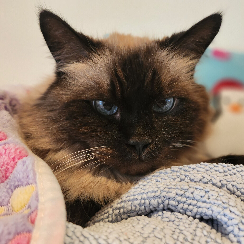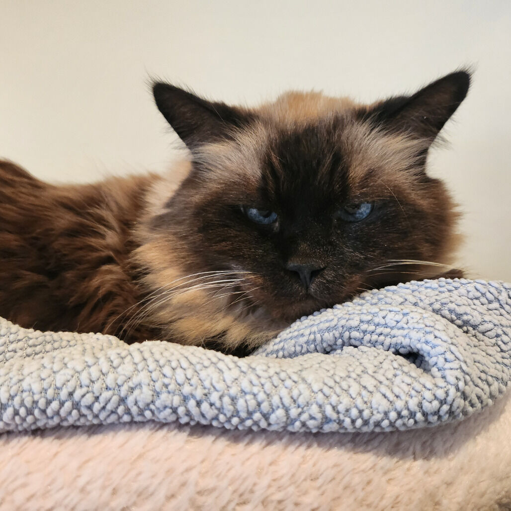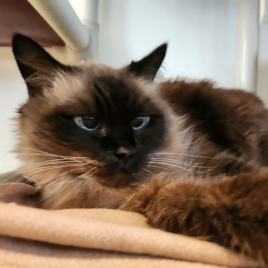 Olsen is shy, but so so sweet. She is slow to warm up and once she does, you'll know by her loud purring. She is soft, gentle, and a proper little lady - you'll find her curled up in a quiet corner with her favorite blanket to snuggle with.