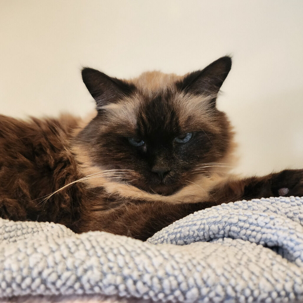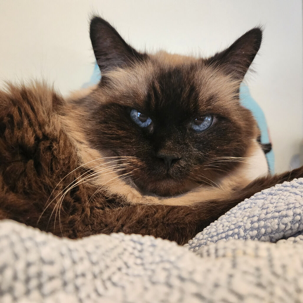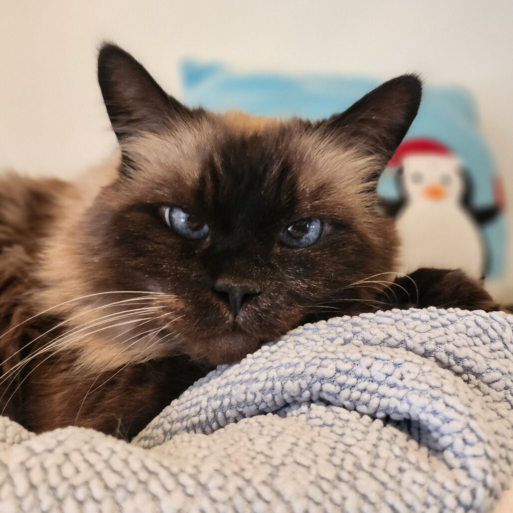 Olsen is shy, but so so sweet. She is slow to warm up and once she does, you'll know by her loud purring. She is soft, gentle, and a proper little lady - you'll find her curled up in a quiet corner with her favorite blanket to snuggle with.