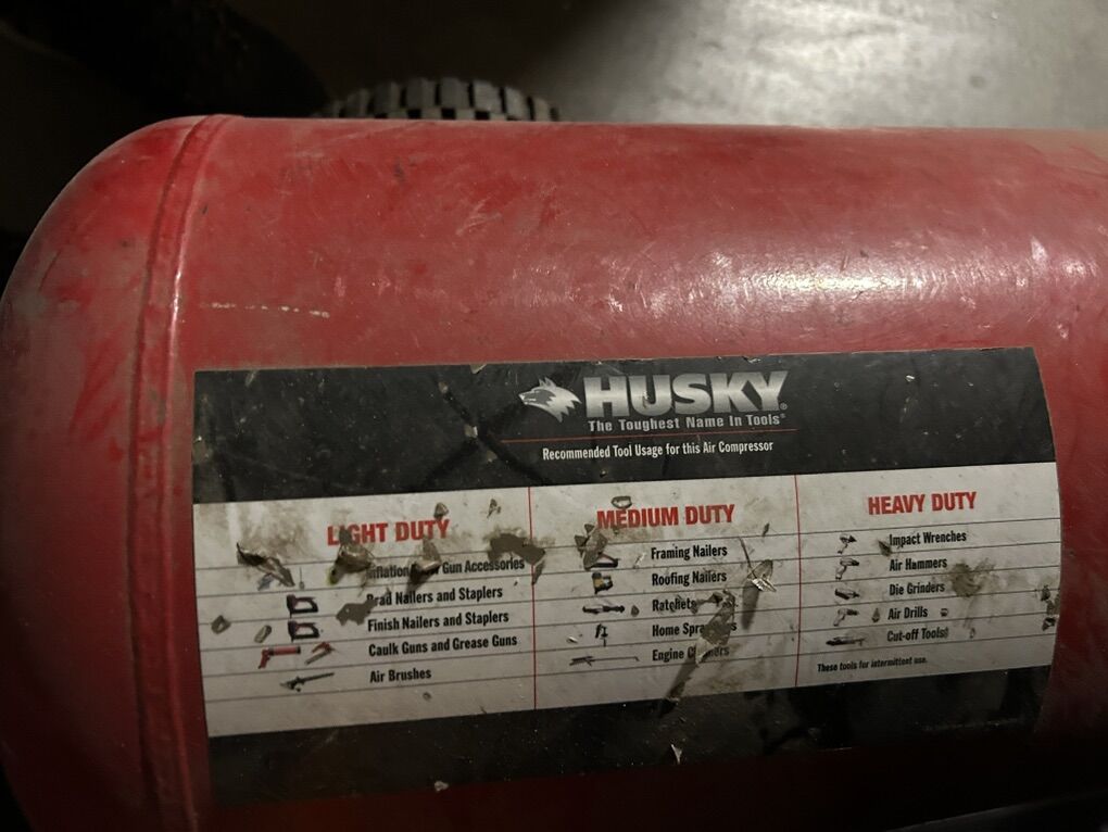 VenmoHusky 19 gallon tank available. The motor went out recently. You can add a compressor to it or add it to your garage as a spare air tank for more capacity.