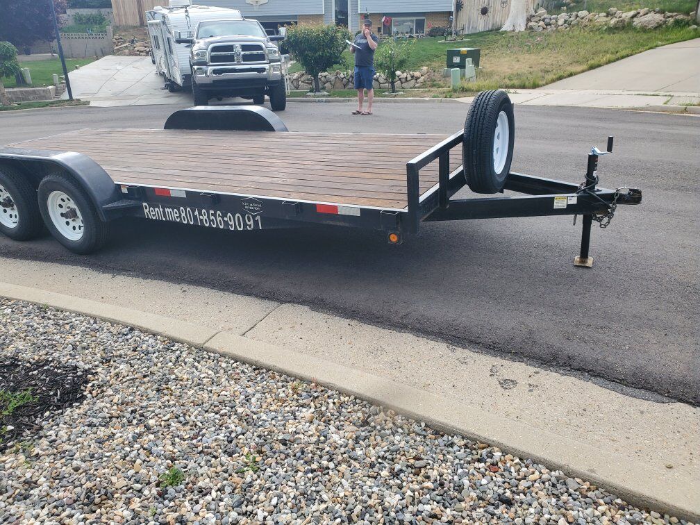 our 18x7 trailer is the perfect solution for your hauling needs,whether its a smaller truck,suv,car or utv/atv, or you need to move something that can't fit in a truck bed. the 18x7 flatbed is plenty of room for furniture or building materials. Easy loading with the ramps that attach to the back. comes equipped with 4 tie downs and move able downs rings for easy load securing ,can include a 9000lb winch for an additional $25. contract required along with valid driver's license and proof of insurance K.R.C RENTAL LLC 801-856-9091