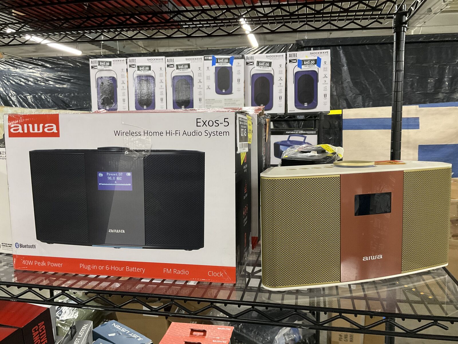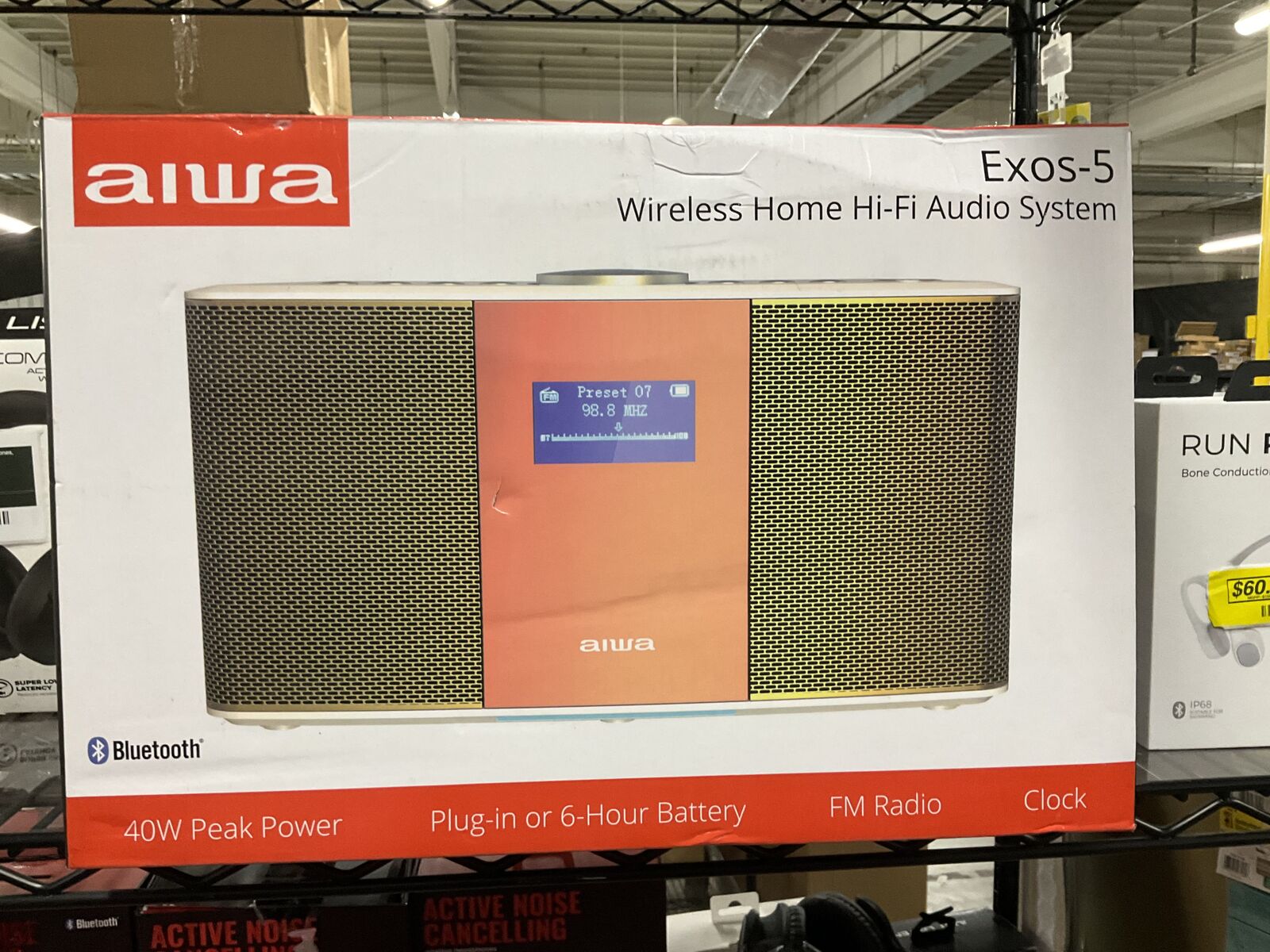The AIWA Exos-5 wireless speaker delivers powerful sound with 40W peak output and adjustable bass and treble. It features analog-style FM tuning along with Bluetooth, USB, and AUX playback options. The LCD display includes a clock and four alarms, making it useful beyond just music. You can run it on battery power or plug it into the wall, so it works great at home or on the go. Easy to use and known for clear, balanced audio
