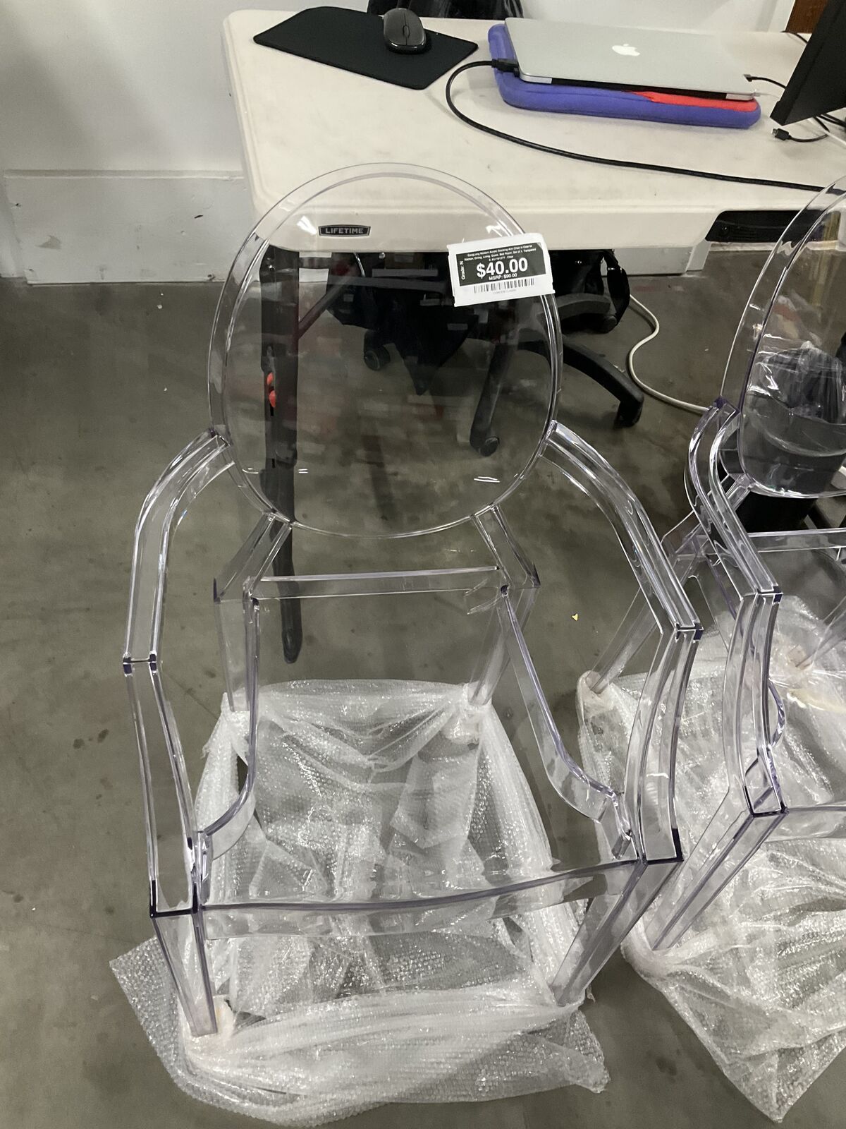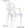 This modern acrylic stacking arm chair features a transparent design inspired by classic Louis XVI style, making it blend easily into almost any space without blocking views or overpowering your décor. The curved arms and contoured seat are designed for comfort and work well for different body types. Made from durable polycarbonate, the chair is shock, scratch, and water resistant and built to last, with smooth floor glides that help protect your floors. It measures 21.125 inches wide by 23 inches deep by 36.5 inches high, supports up to 700 lbs, and can be stacked up to seven chairs high for easy storage.