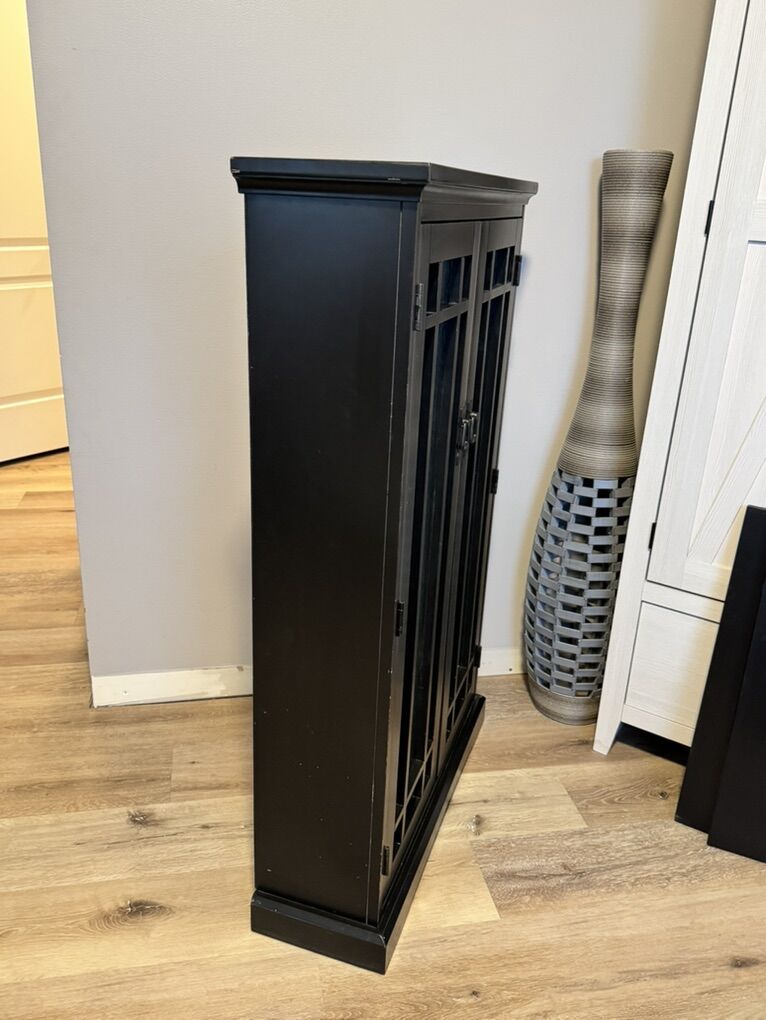 VenmoBlack wooden cabinet with doors in great condition! It currently has 3 shelves in it but there are 2 extras that can be added in (I don’t have pegs for them though)