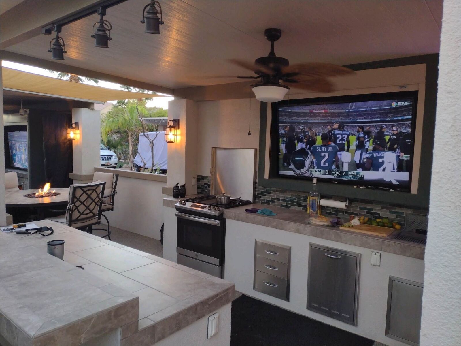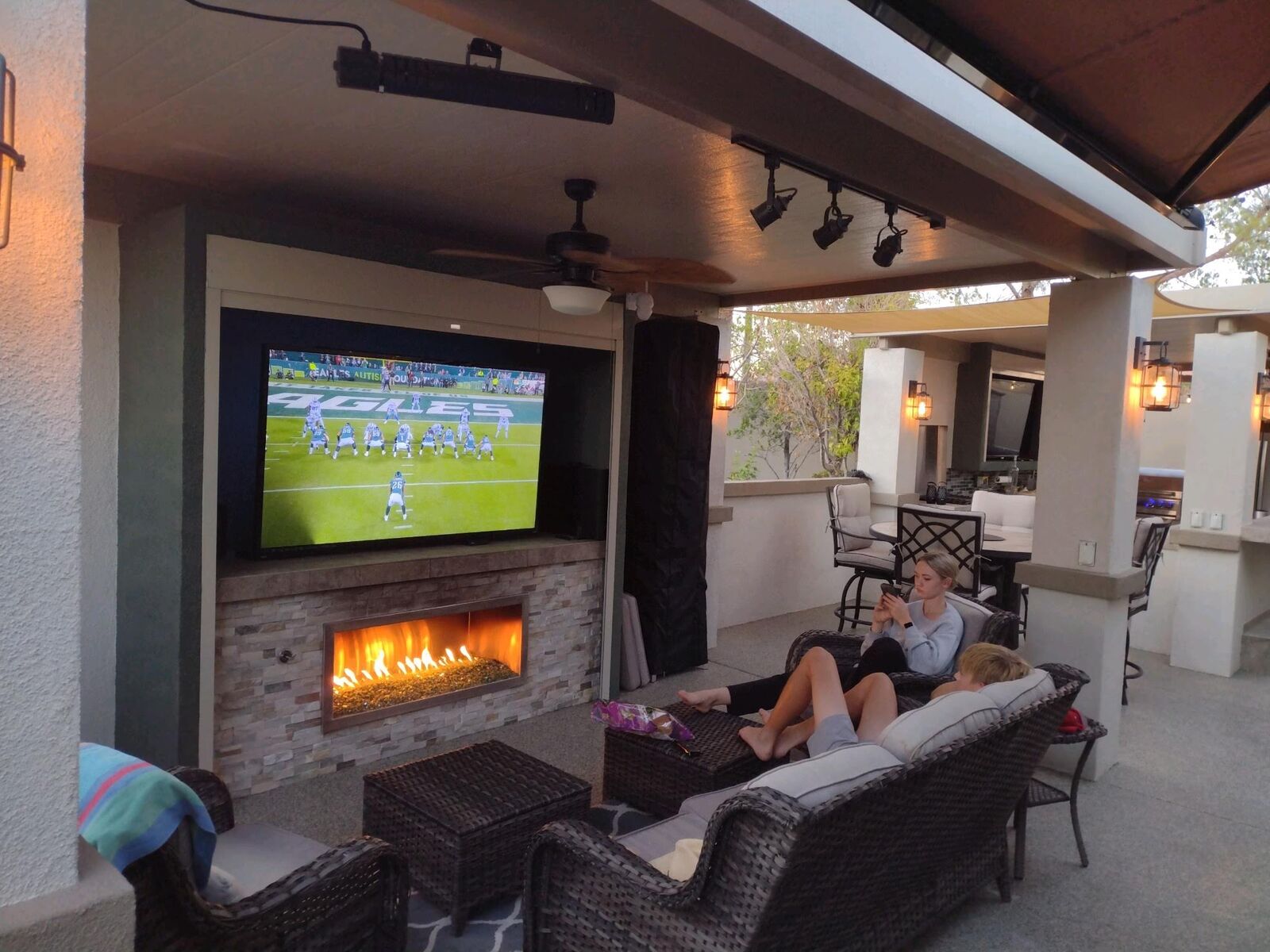Two massive outdoor TVs, discreetly hidden behind motorized roller shades