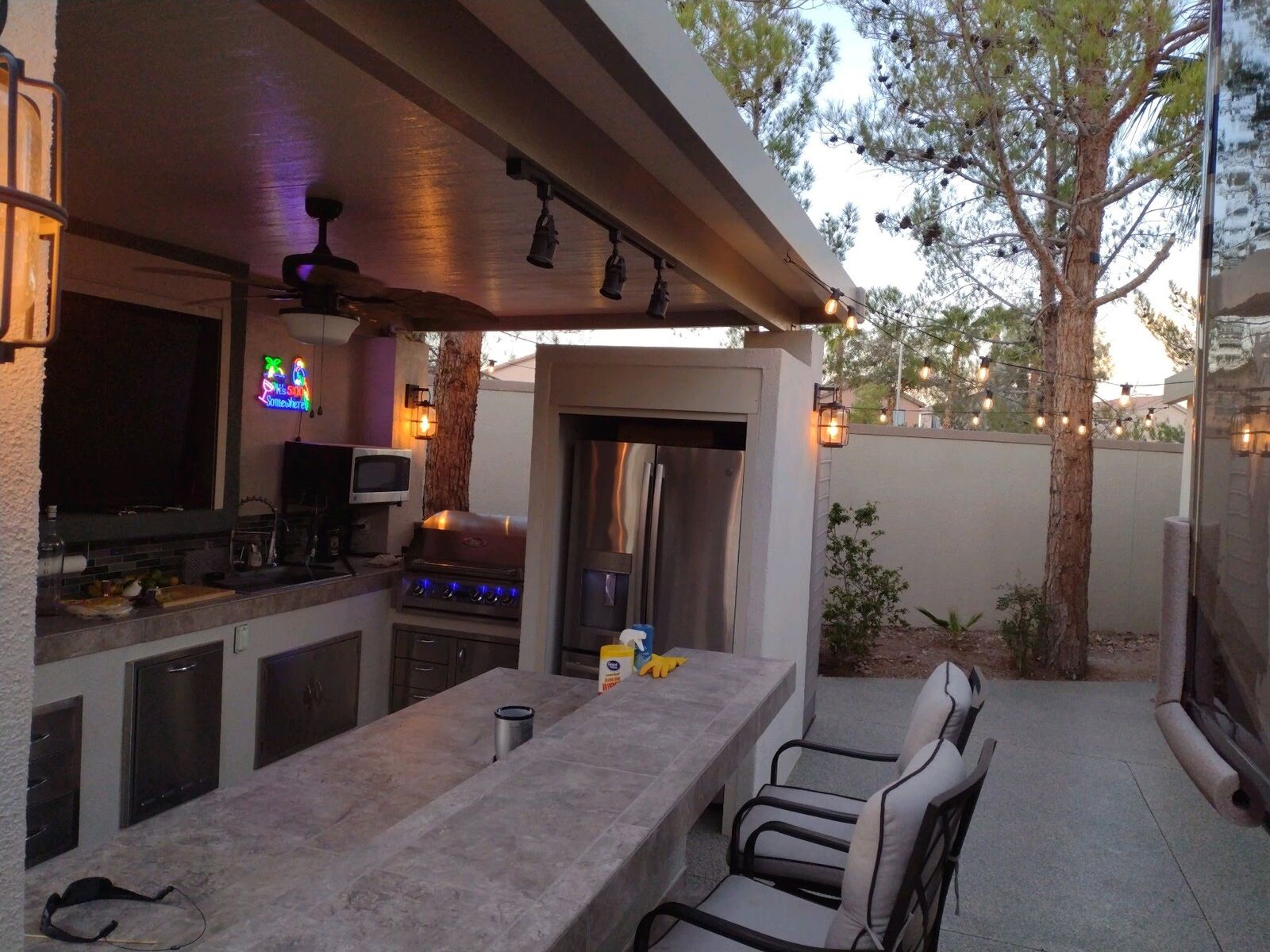 Full gourmet outdoor kitchen with high-end stainless appliances • Tile countertops & breakfast bar • Built-in gas grill • Full-size refrigerator & freezer • Disposal, hot water heater, and reverse-osmosis drinking water