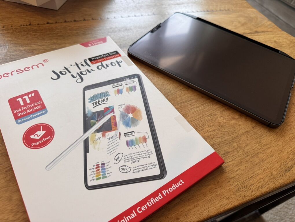 -Bersem “paperlike” screen protector makes it feel like you’re writing on paper preventing the screen from feeling “slippery” while writing. The package has one extra unused cover still in it with installation tools and instructions.