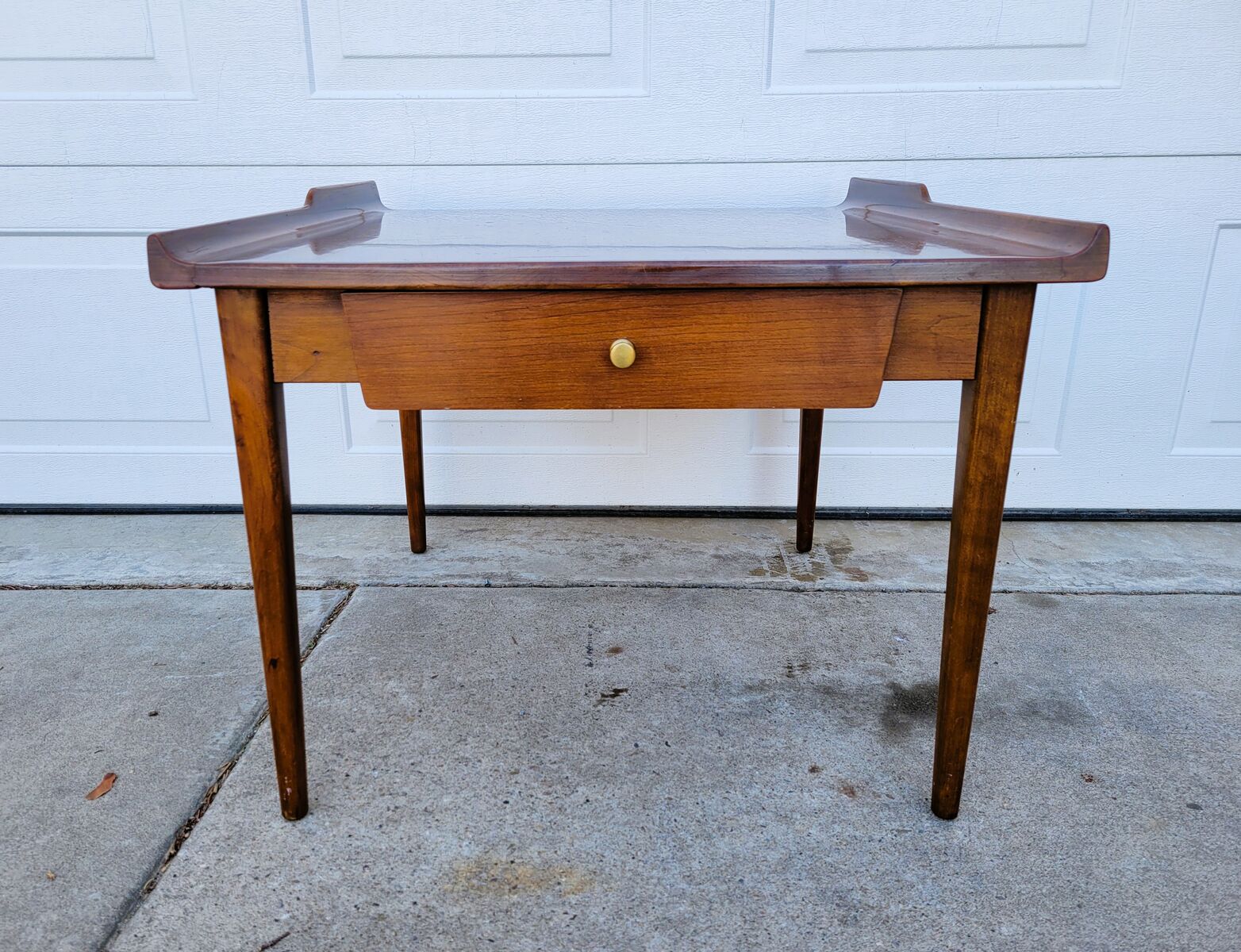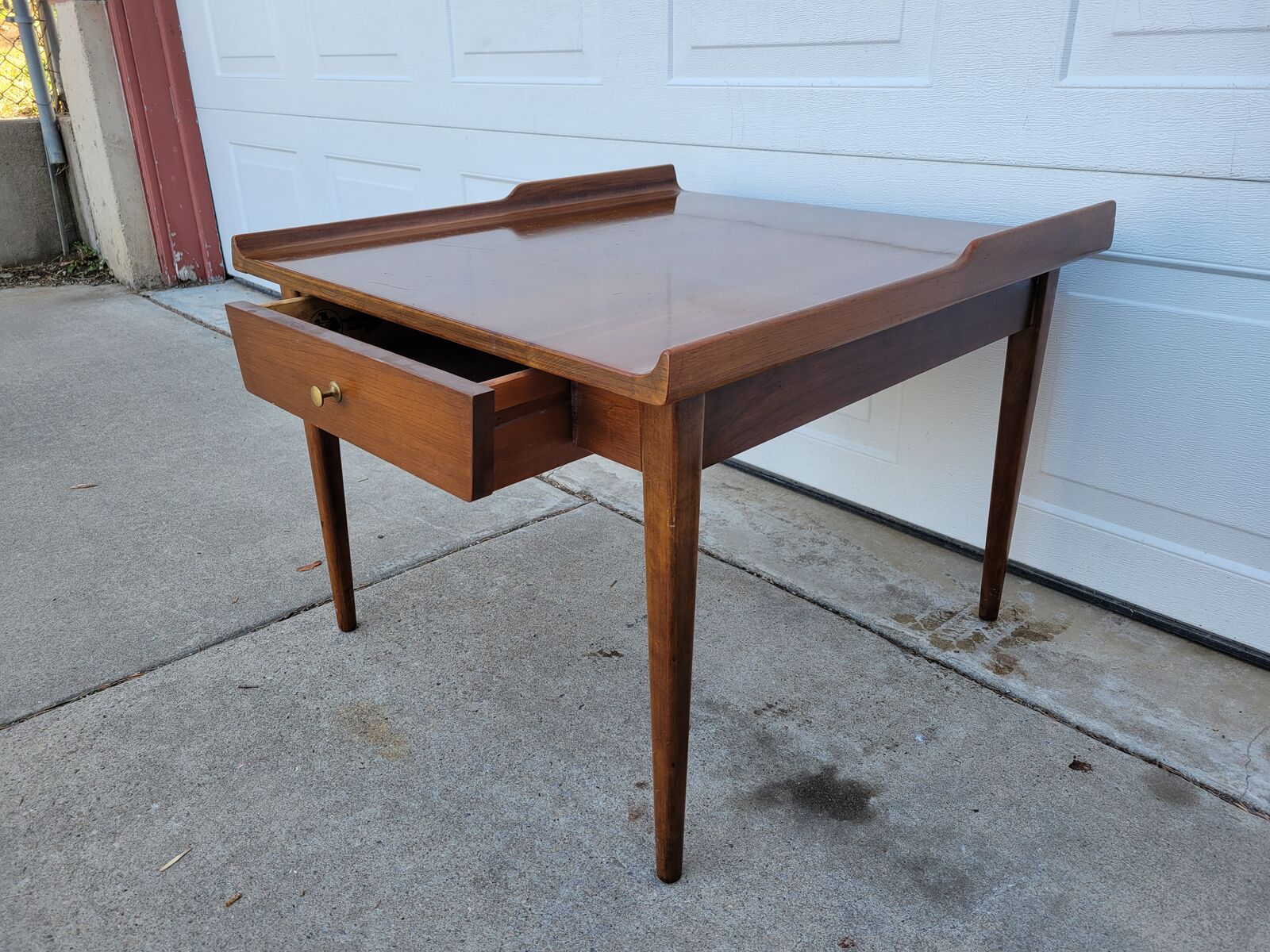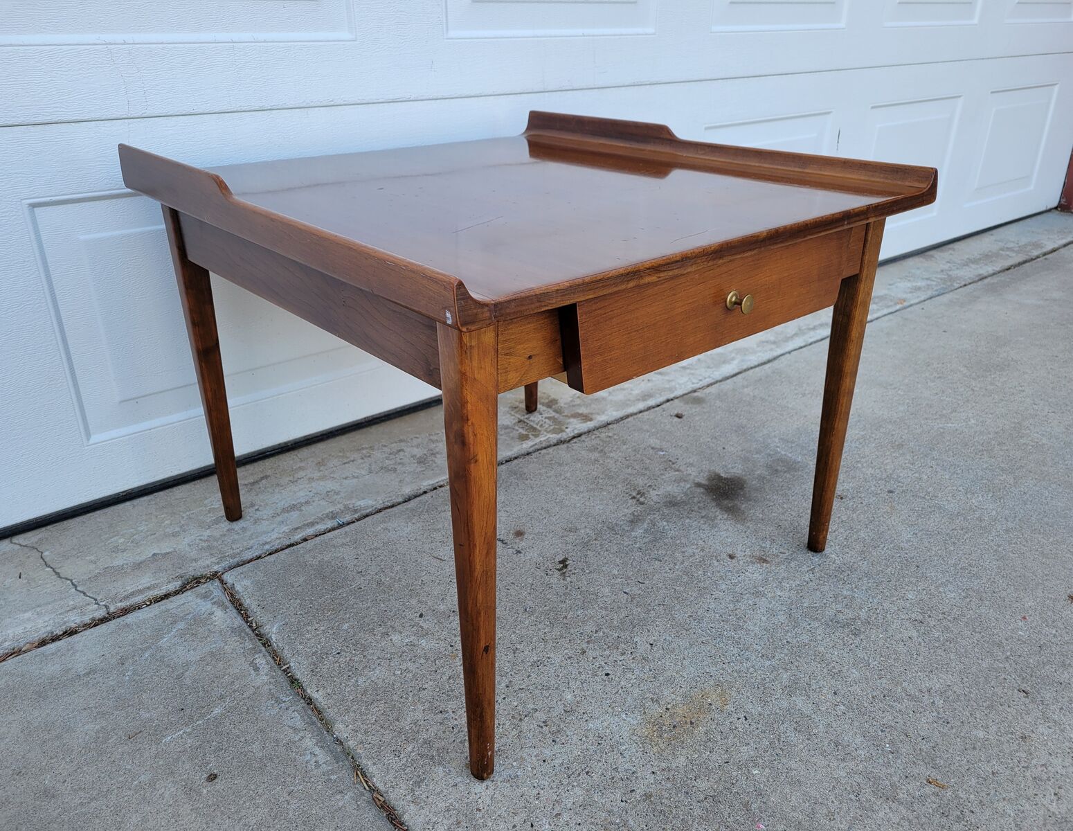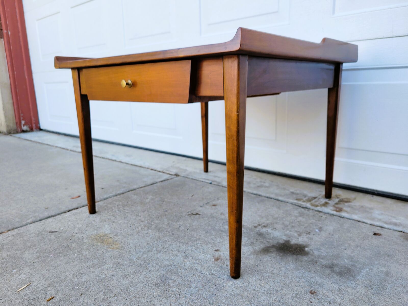This is a gorgeous, solid wood end table/nightstand made in the US by Heywood-Wakefield. Very good condition with just a couple of scratches on top. The drawer glides well and is dovetail construction. Neat and clean. Solid legs. Wonderful addition to any mid century collection.
