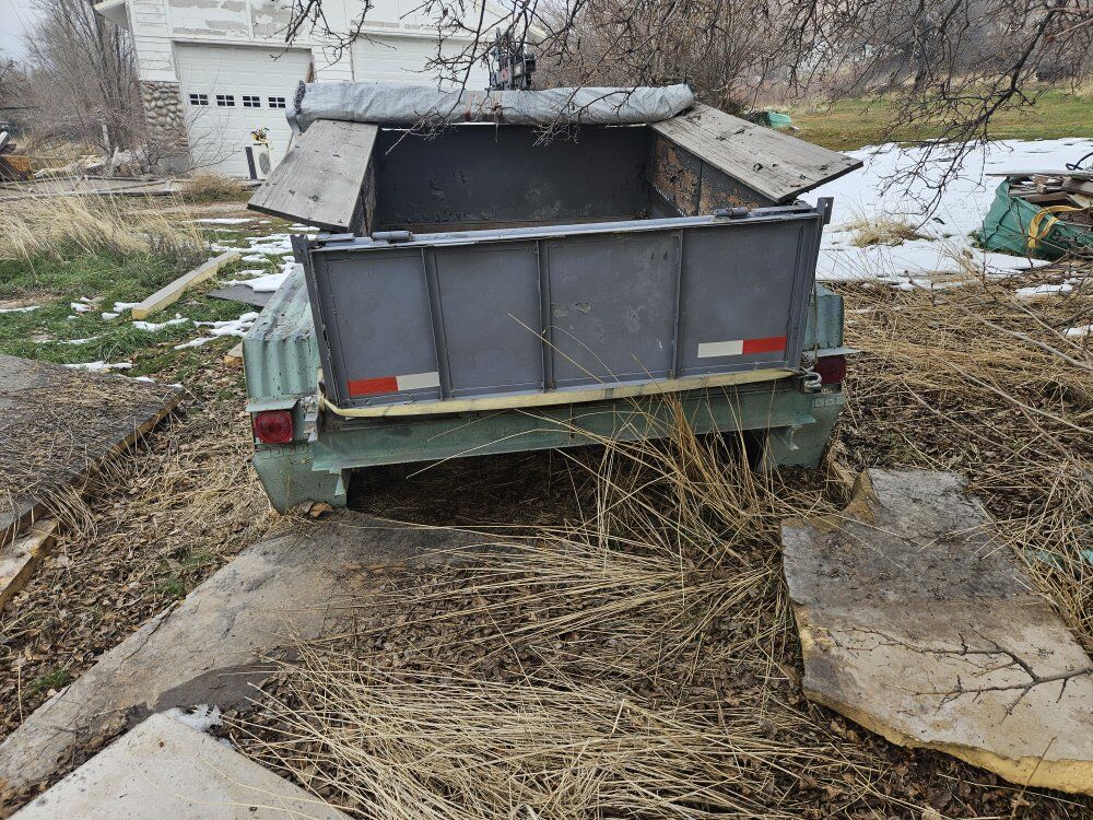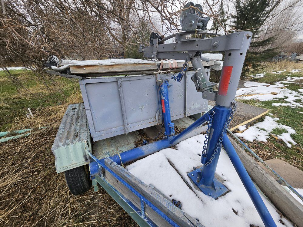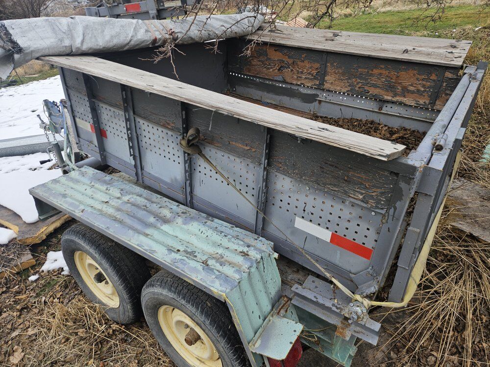 ZelleHand-Built Dump Trailer w/ Manual Hydraulic Pump, Spreader Gate & Transfer Crane Old-school, heavy-duty dump trailer that was hand-built by an old farmer. Features: Tandem axle dump trailer tows well, and has sway bar