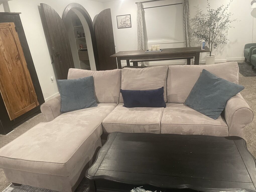 Light gray couch the ottoman leg seat is reversible either left or right , suede material , comfortable pick up in Bluffdale
