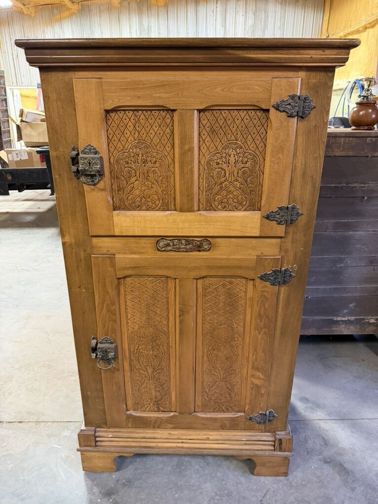 VenmoAuthentic Alaska brand antique wooden icebox from the early 1900s. Solid oak construction with original metal-lined interior, working doors, and original hinges and latches. This is a genuine icebox — not a reproduction — with beautiful aged patina and craftsmanship you don’t see today.