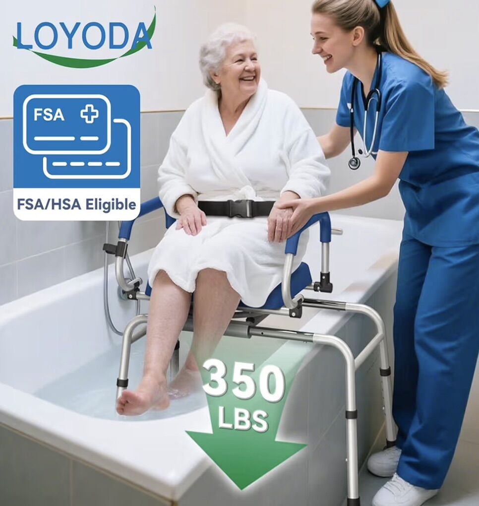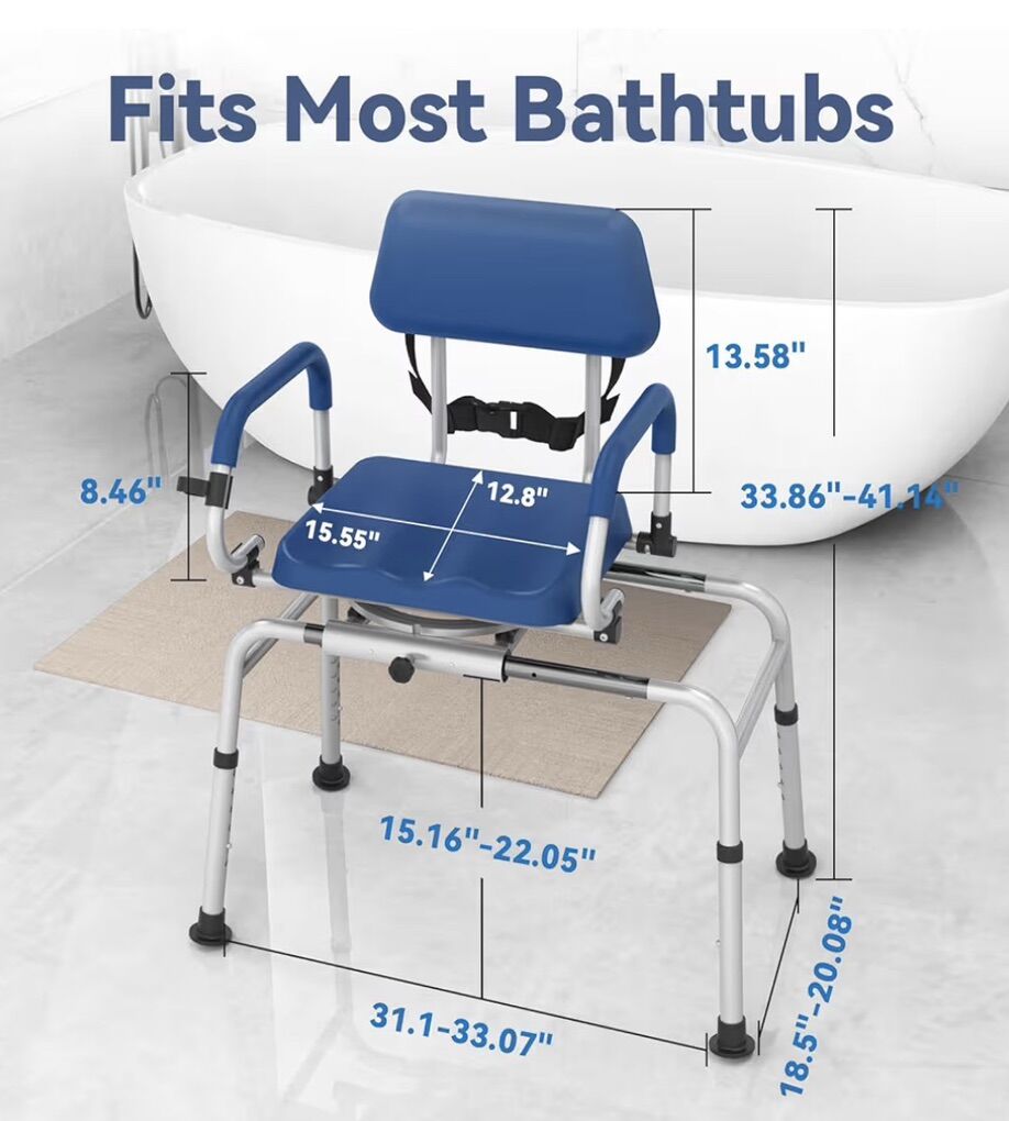 Loyoda Sliding Shower Chair Tub Transfer Bench with Swivel Seat, Premium Padded Seat and Backrest, Pivoting Arms, 250lbs