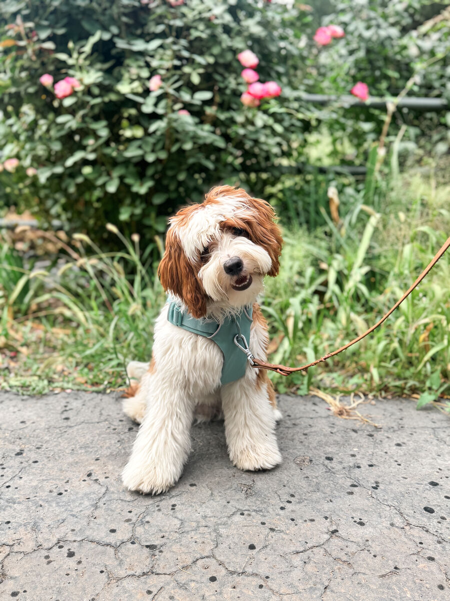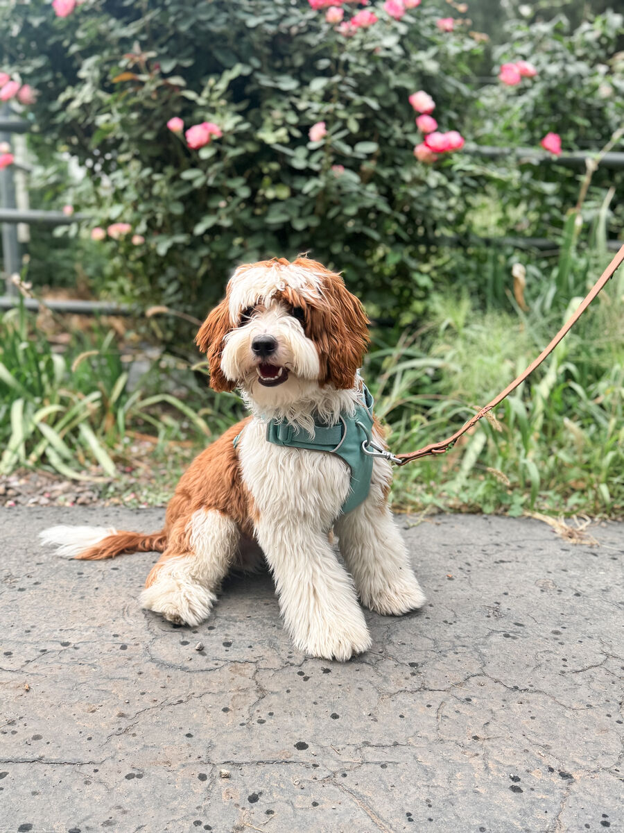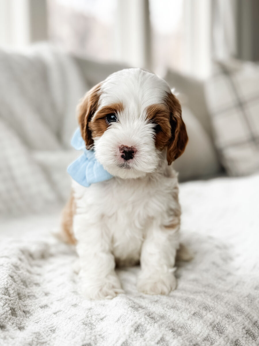 Cedar weighs 15 lbs, with absolutely perfect proportions and square structure (NOT leggy and not short legged). He has an extremely deep red tuxedo wavy coat and he produces strong tuxedo markings in his puppies as well. His coat is extremely soft and velvety. Cedar has a wonderful temperament, he is very confident and outgoing, without being overly energetic. He has a great medium temperament and zero signs of anxiety (which can be an issue for Cavapoos).