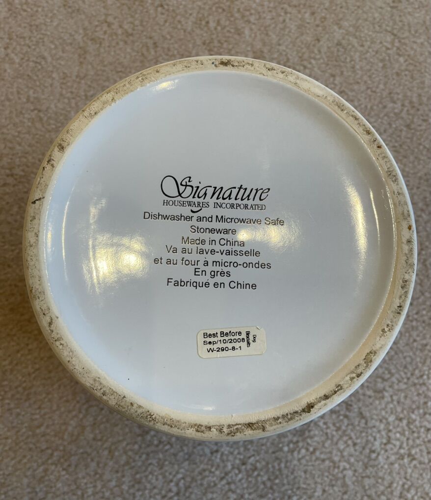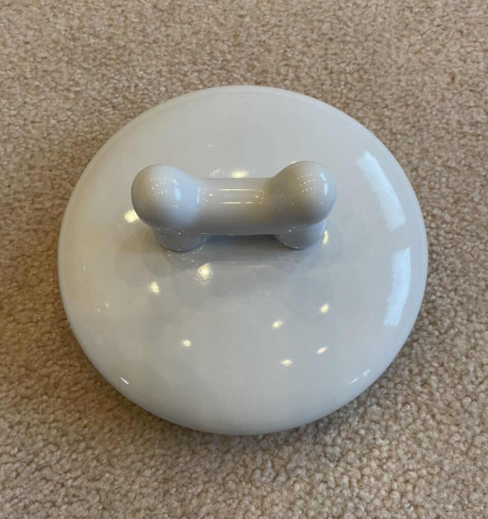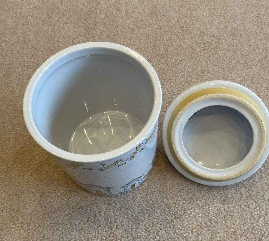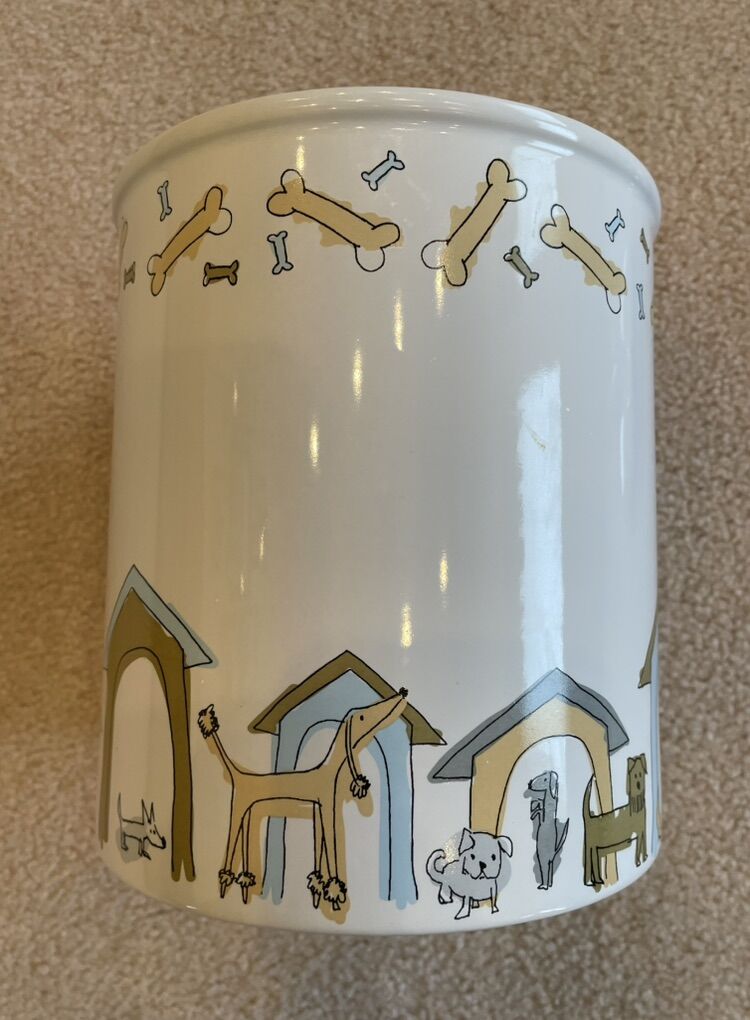VenmoThis is a Signature Housewares Ceramic cookie/treat jar. It is heavy duty and features varied types and sizes of dogs with their respective dog houses along the base of the jar. On the top there are bones placed in various positions. Each of the dogs, dog houses, and bones are of various colors. The lid is also made of heavy ceramic and features a cute dog bone as the handle to lift the lid. On the inside of the lid is a rubber seal that fits tight to the jar. With the lid on it is just under 12” high. It is 7.5” in diameter. It has never been used and is in excellent condition. There are no chips, cracks or signs of ware.
