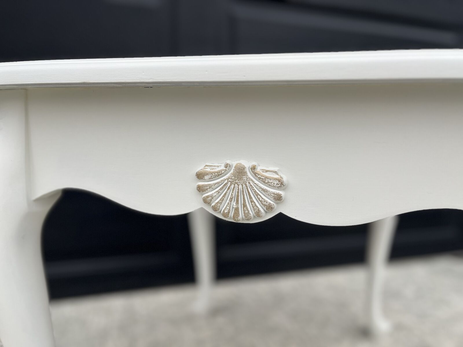 Classic cabriole legs, spoon feet, and original shell medallion accented with gold. French Provincial style.