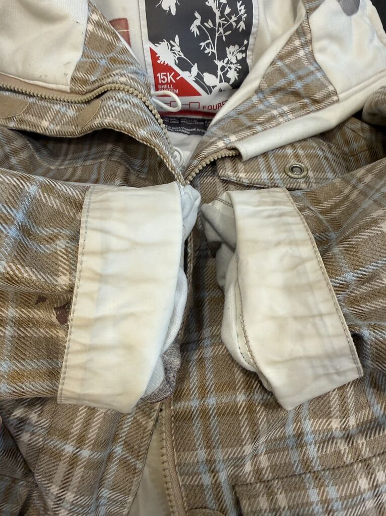 VenmoFourSquare snowboarding/winter jacket, Women’s size M. Some slight staining on collar, inside of sleeves, and on the bottom inside of the jacket, as shown in pictures. Has armpit vents. All zippers and Velcro work great.