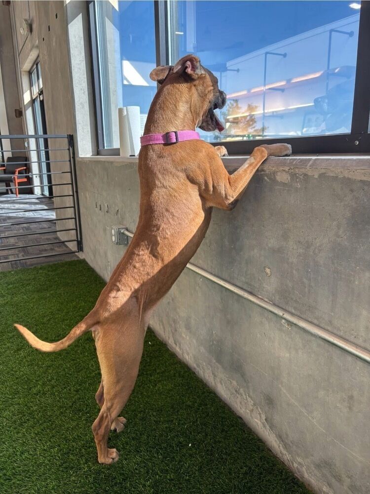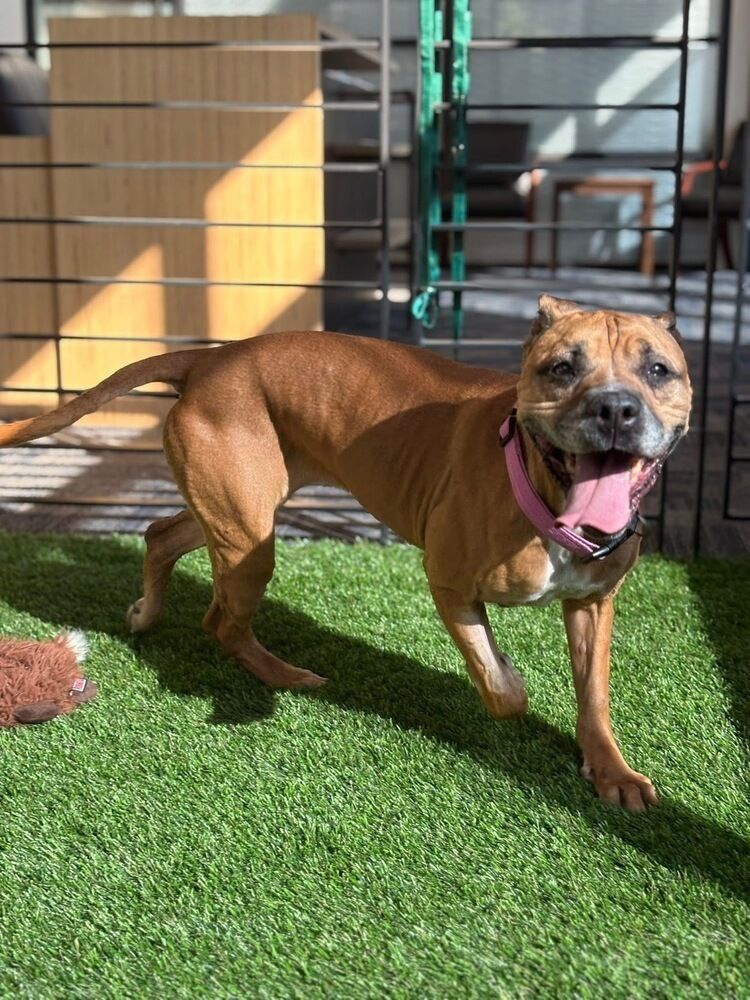 Bella is a boxer mix and is about 9–10 years old and truly a sweetheart! She is incredibly well-behaved and does wonderfully with all kinds of people. Bella has a gentle, loving nature that makes her easy to be around and a joy to know.