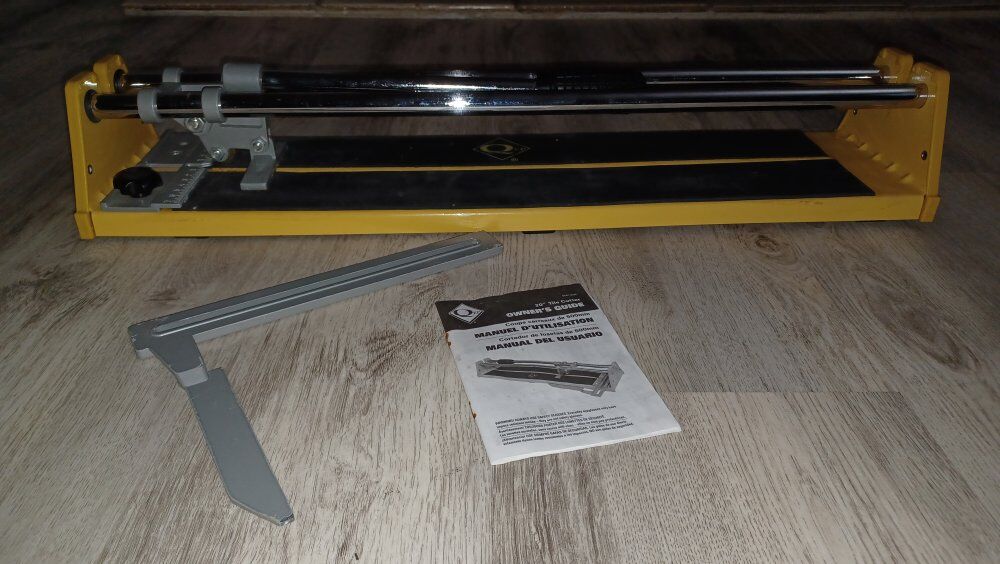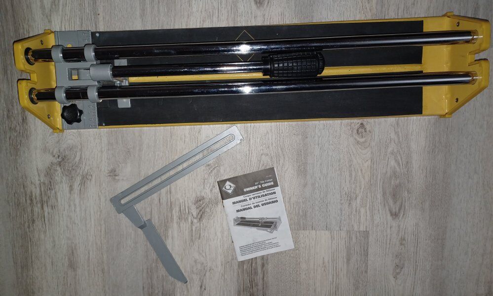 Qep 20 inch Tile Cutter Cuts ceramic and porcelain tile. dual chrome plated steel rails. Powder coated steel base with extra reinforcement. Straight edge adjustible measurement guide. Soft grip handle with blade storage compartment. Retail at ACE is $54.99 plus tax. FCFS Cash accepted.