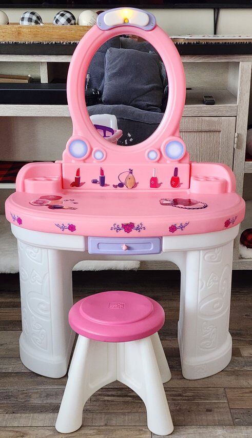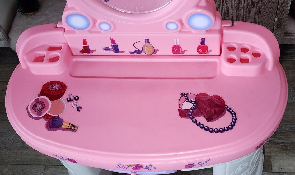 VenmoPretty & Posh Toddler/Kids Vanity Play Set. Comes with chair and Vanity. There is some sticker residue left on the mirror. The light does work. There is some slight marks from some spilled nail polish but you can barely see it in person let alone on camera.