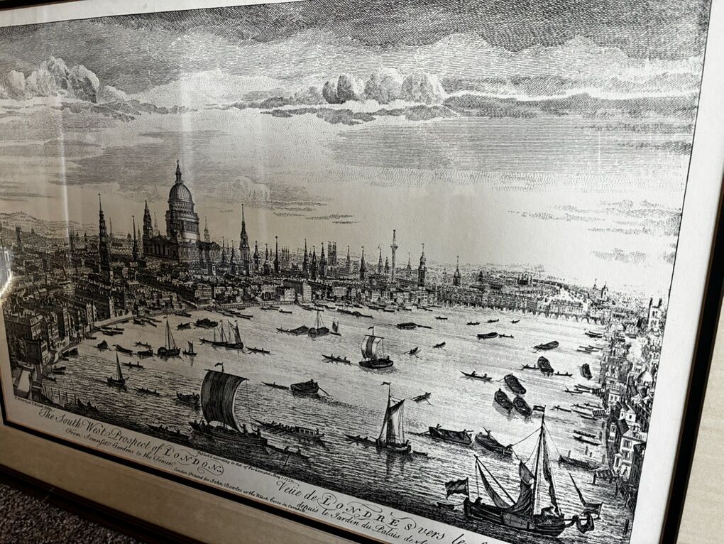 Venmohis is a print of a historical etching titled The South-West Prospect of London from Somerset Gardens to the Tower. The original artwork was created by Samuel and Nathaniel Buck and published around 1749. It is a detailed panoramic view of the River Thames and the London skyline during the mid-18th century, featuring St. Paul's Cathedral as a central focal point. The print captures a moment in time before significant changes to the city, such as the removal of houses from London Bridge, which began shortly after the original publication. The text at the bottom indicates it was Publish'd according to act of Parlia[ment], a common practice for published prints of the era.