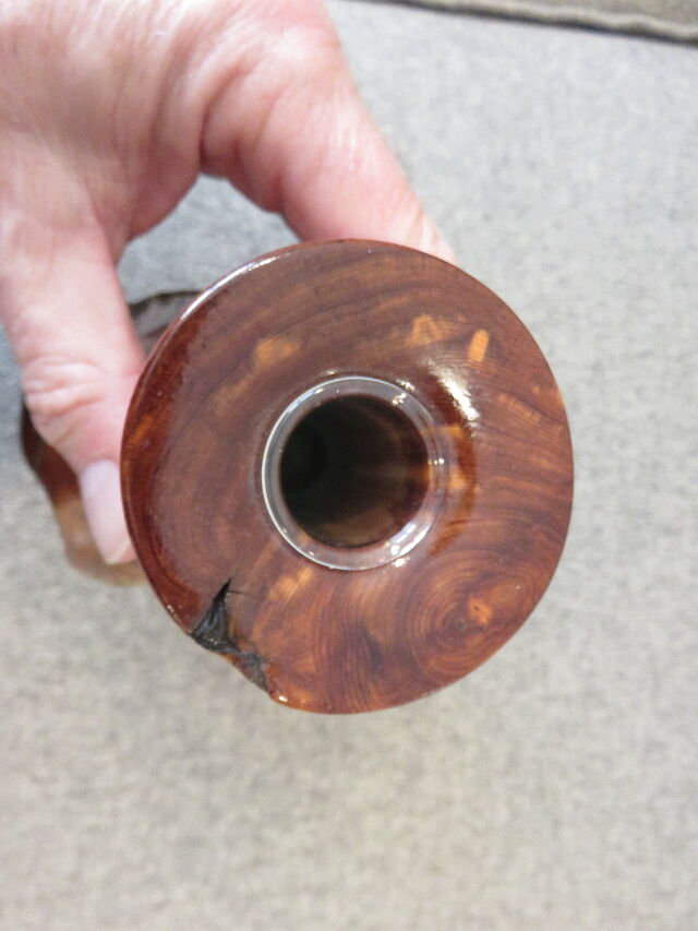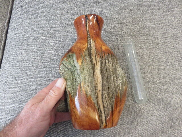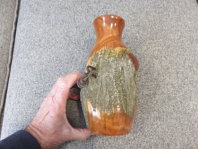 My brother purchased this beautiful and authentic Wood Fence Post Vase; which still has the original chain links from the fence imbedded into is wood; about 4 years ago to decorate a cabin he was refurbishing in Montana. The cabin never finished being refurbished, and this is one of several decorations purchased for it that stayed in the original bag from the maker's shop that was never used.