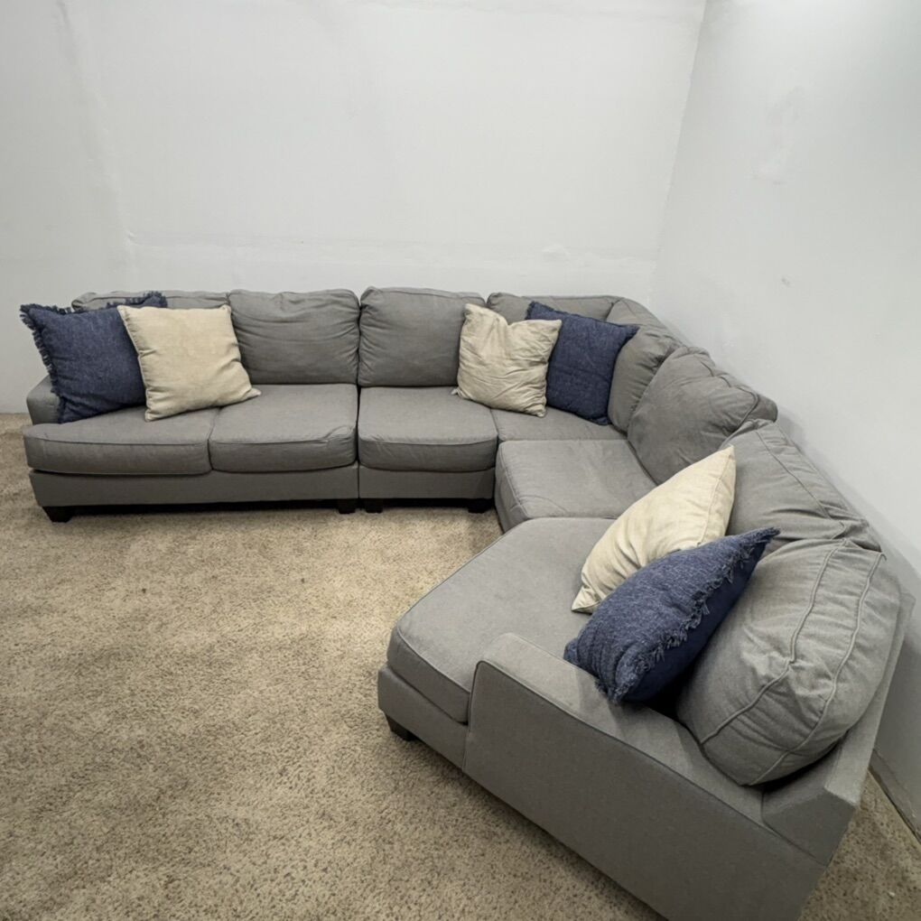 This modular fabric sectional comes apart into five pieces. Each of the seat cushions are a machine washable. Delivery at deep clean available.