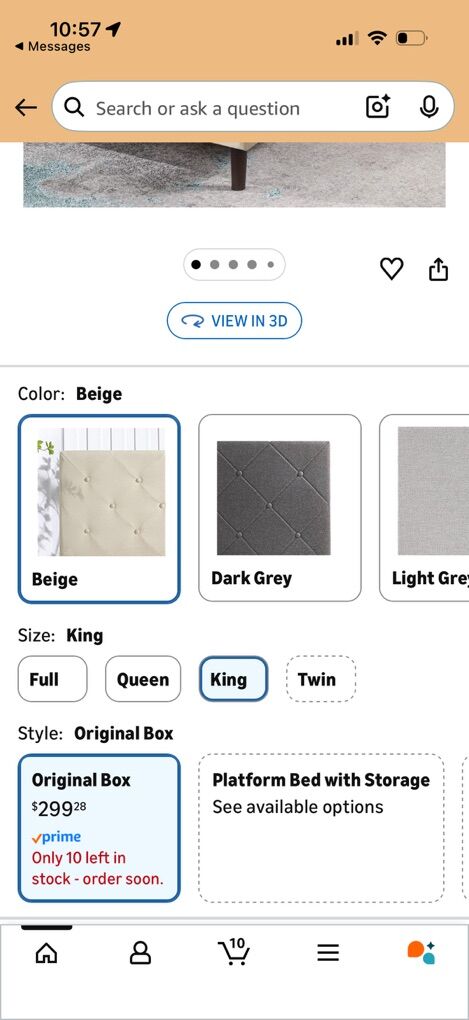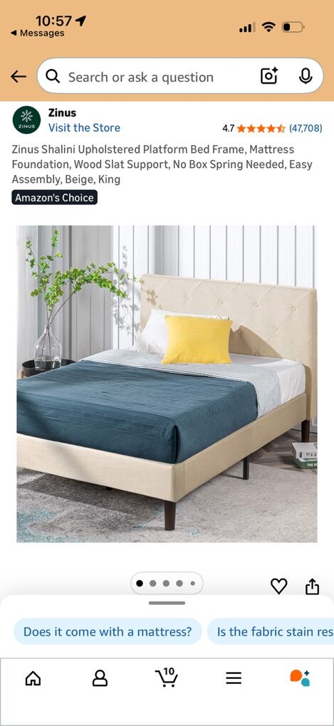 ApplePayZinus Shalini king-size upholstered platform bed frame in a neutral beige fabric. This bed includes wood slat support and a strong frame — no box spring needed — and provides great support for your mattress.