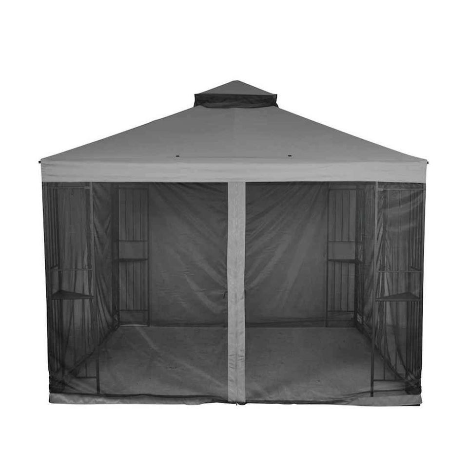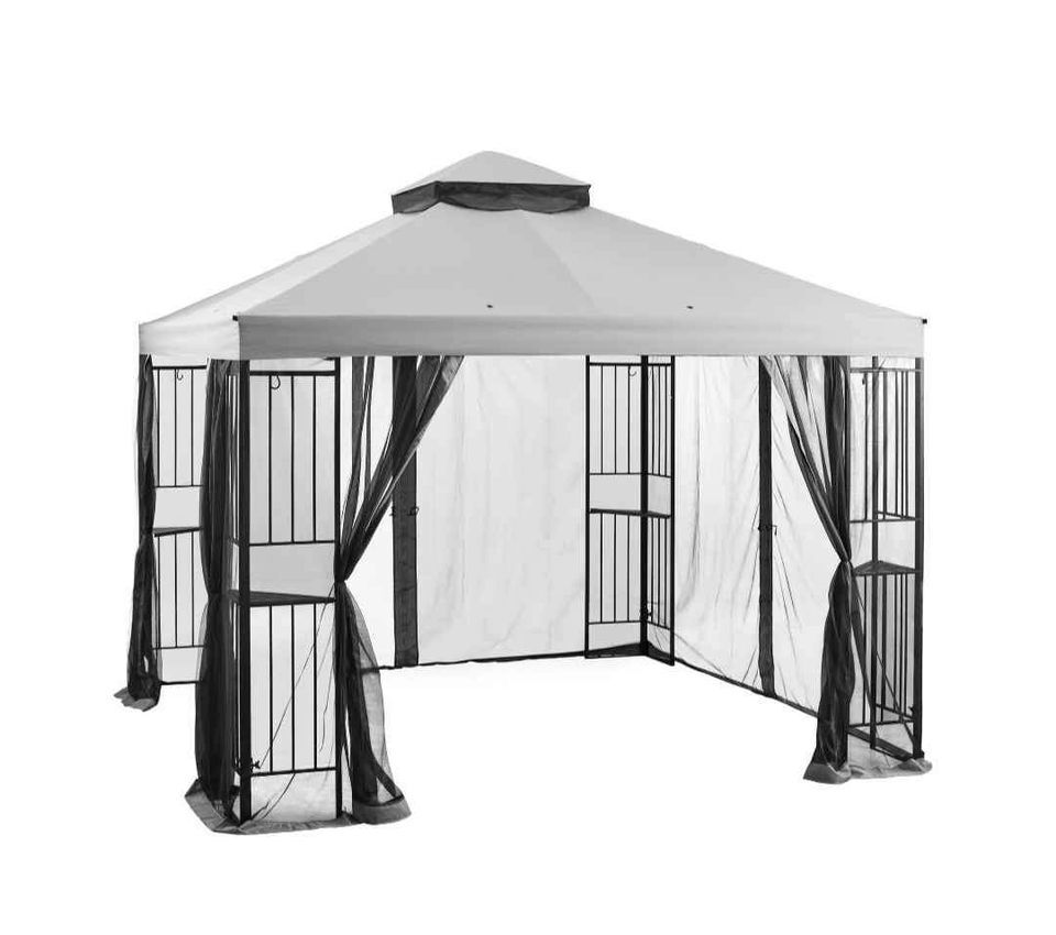 The Mainstays 10' x 10' Easy Assembly Gazebo is made with Gray fade-resistant fabric that will provide both long wear & durability. It has a two-tiered roof for better airflow and provides an elegant allure. This gazebo is easy it is to assemble, absolutely no bolts or tools are necessary. This gazebo is put together with hand-tightening clamps that hold the pieces together. The beautiful Mainstays 10' x 10' Easy Assembly Gazebo is a perfect addition to any location, it can be put it on your yard or deck. Its powder coated in a matte black finish and has a grey canopy with black mosquito netting.