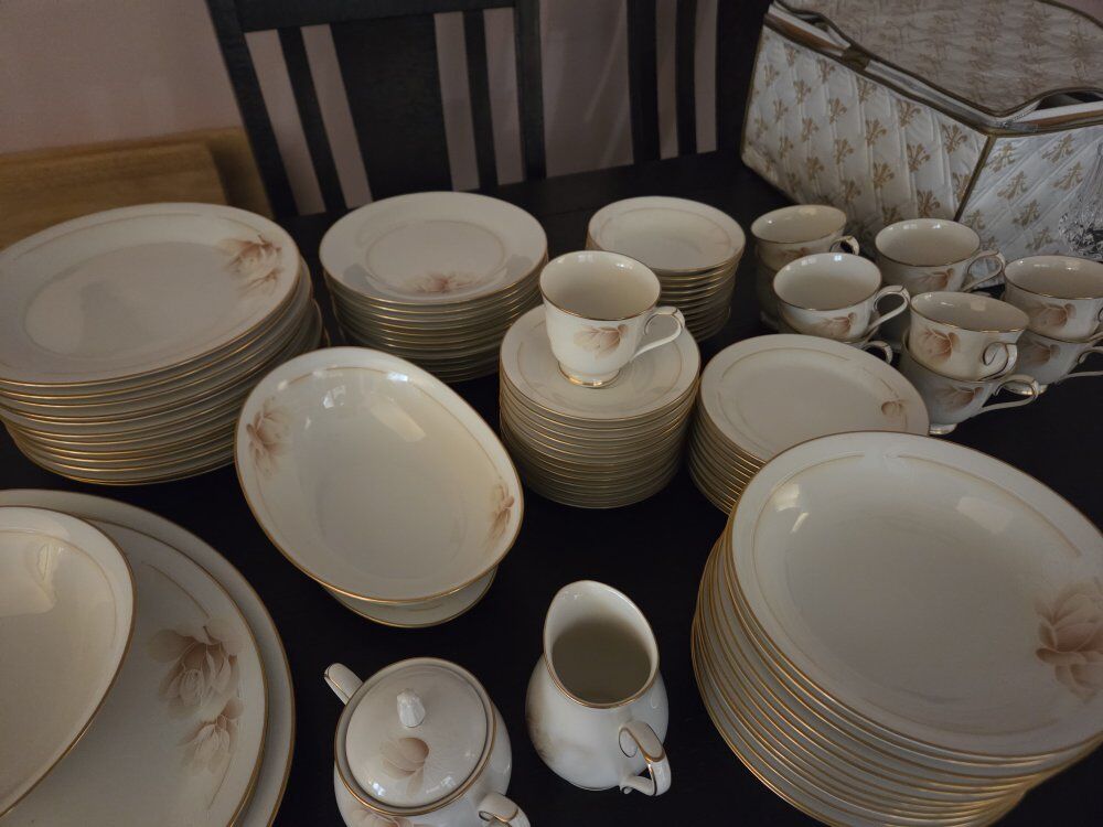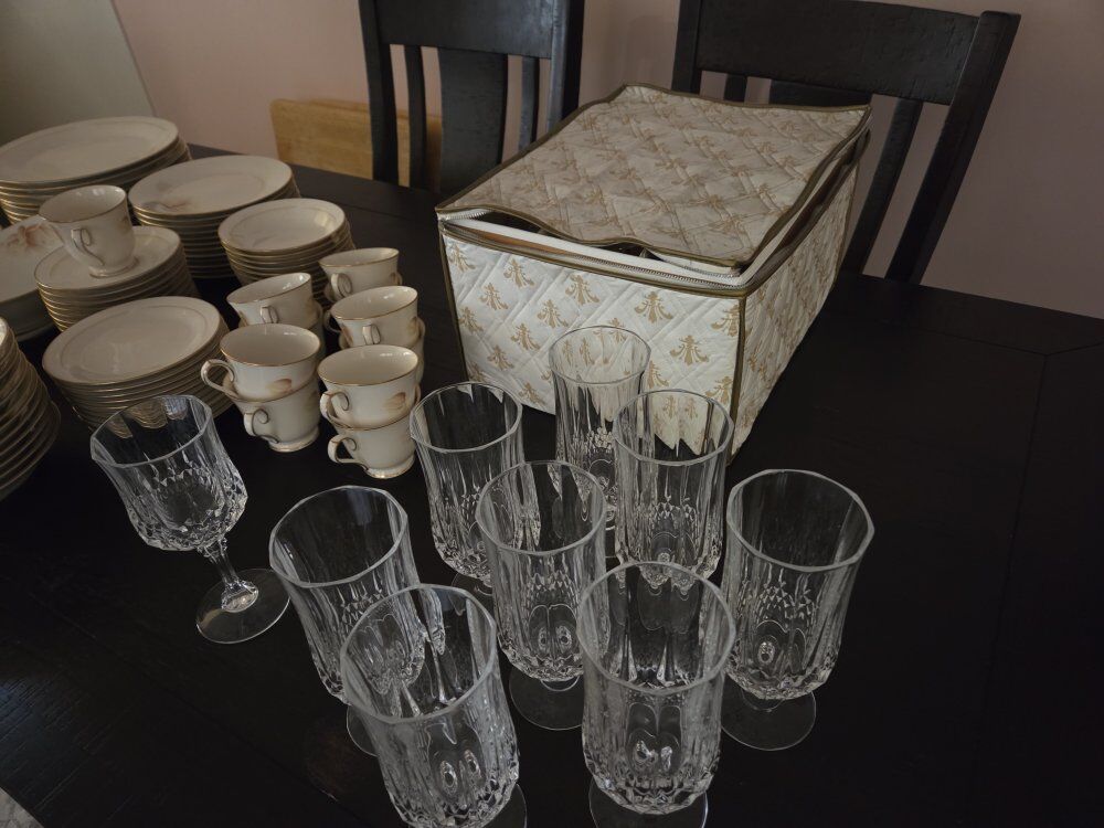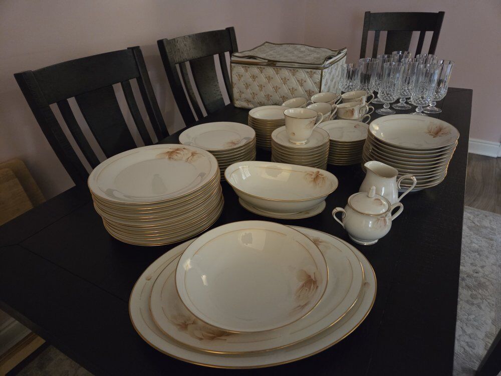 Noritake Ivory China, pattern 7271, Devotion. 12 place set, missing 1 plate , 1 cup. includes 8 water glasses, 12 wine glasses. pick up in Millcreek area. contact Sharon Murphy 801-484-0528.