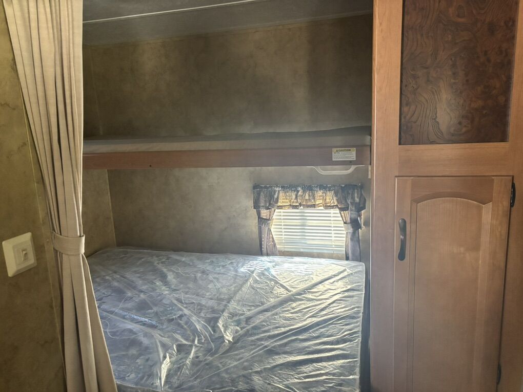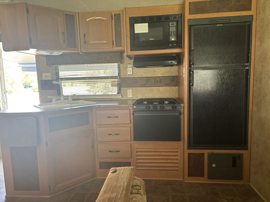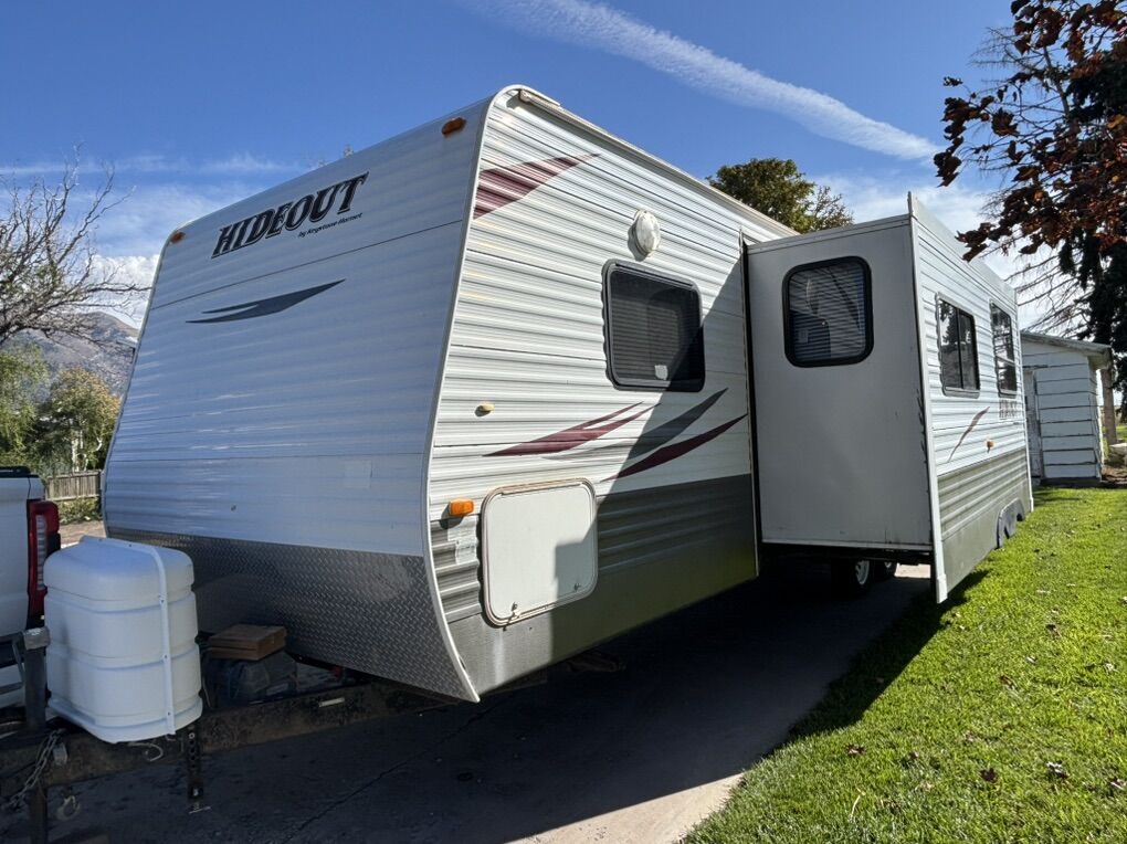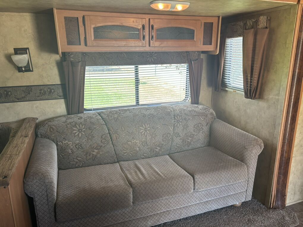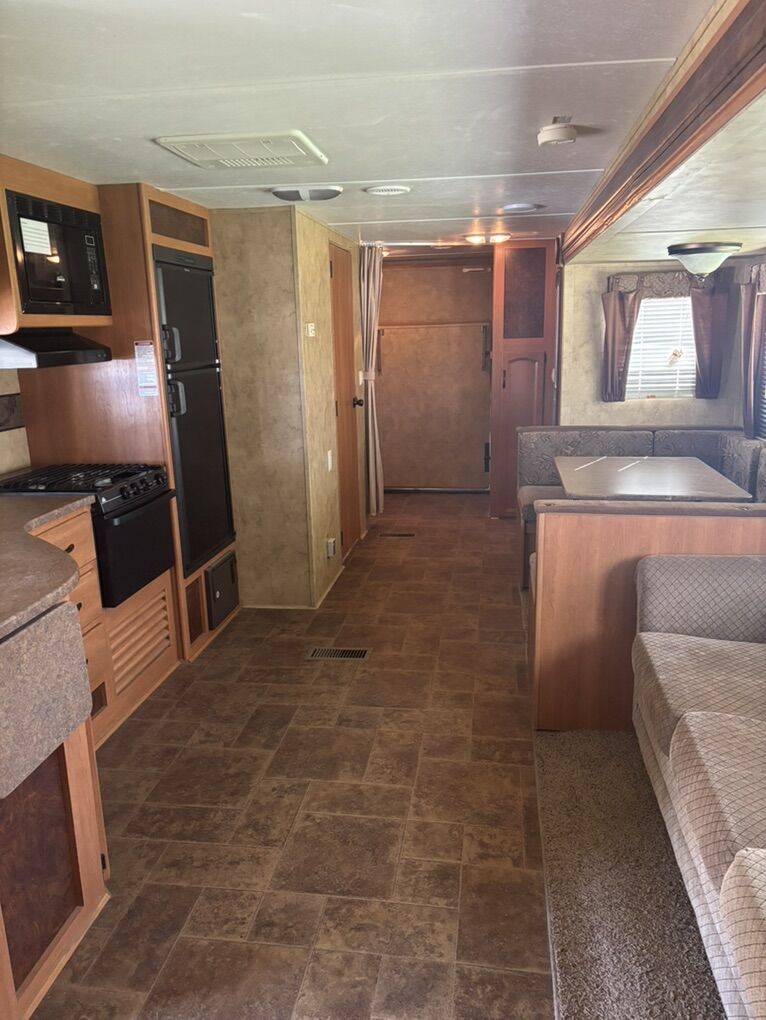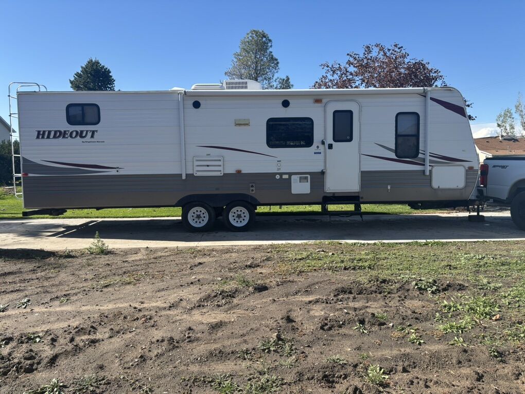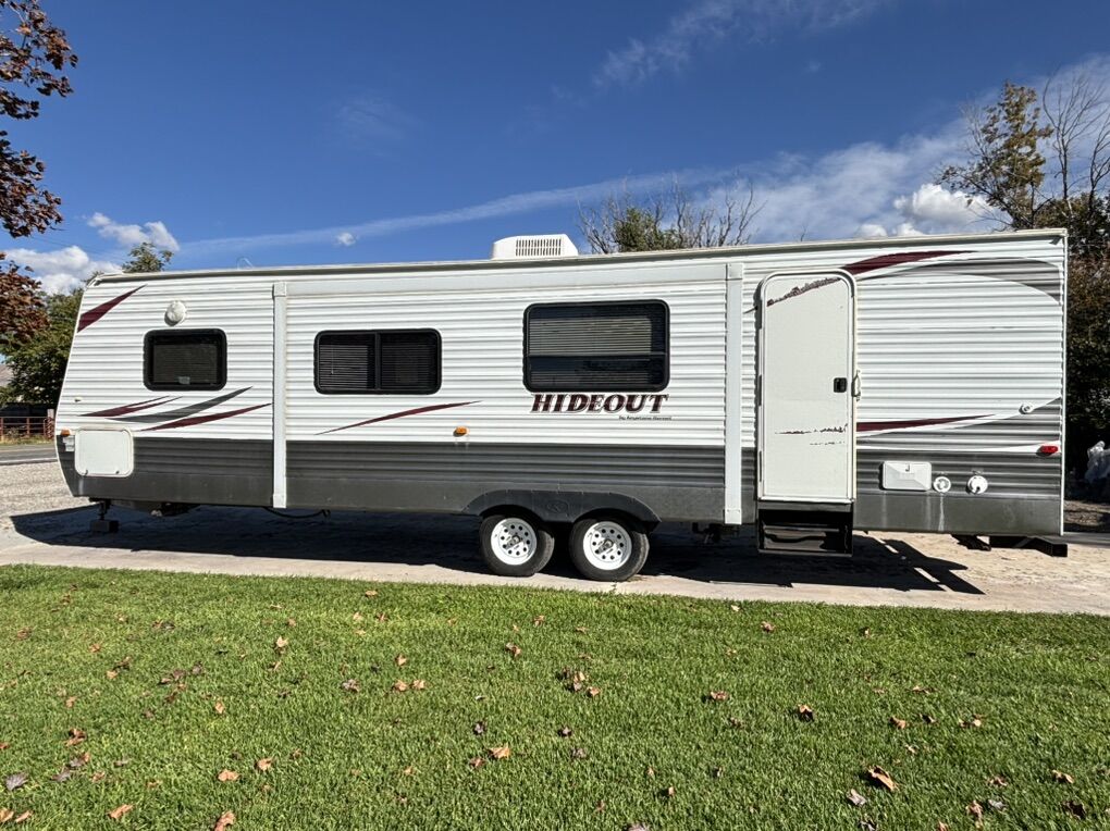 33 ft overall trailer. 1 slide out, Sleeps 9. New tires, 2 new batteries, wheels greased last year. Functioning plumbing, 2 door access, microwave, 3 burner stove, oven. Gas fridge A/c, gas furnace, fold down couch, and dinette, original material on couch and dinette. Covered to protect material. 3speakers 1 outside, TV and cd player. Awning replaced a few years ago. 45 gal fresh water. 38 gray water, 38 black water. Hitch not included. In really good condition. $10000.00
