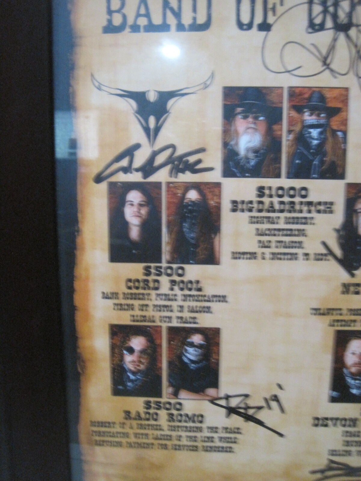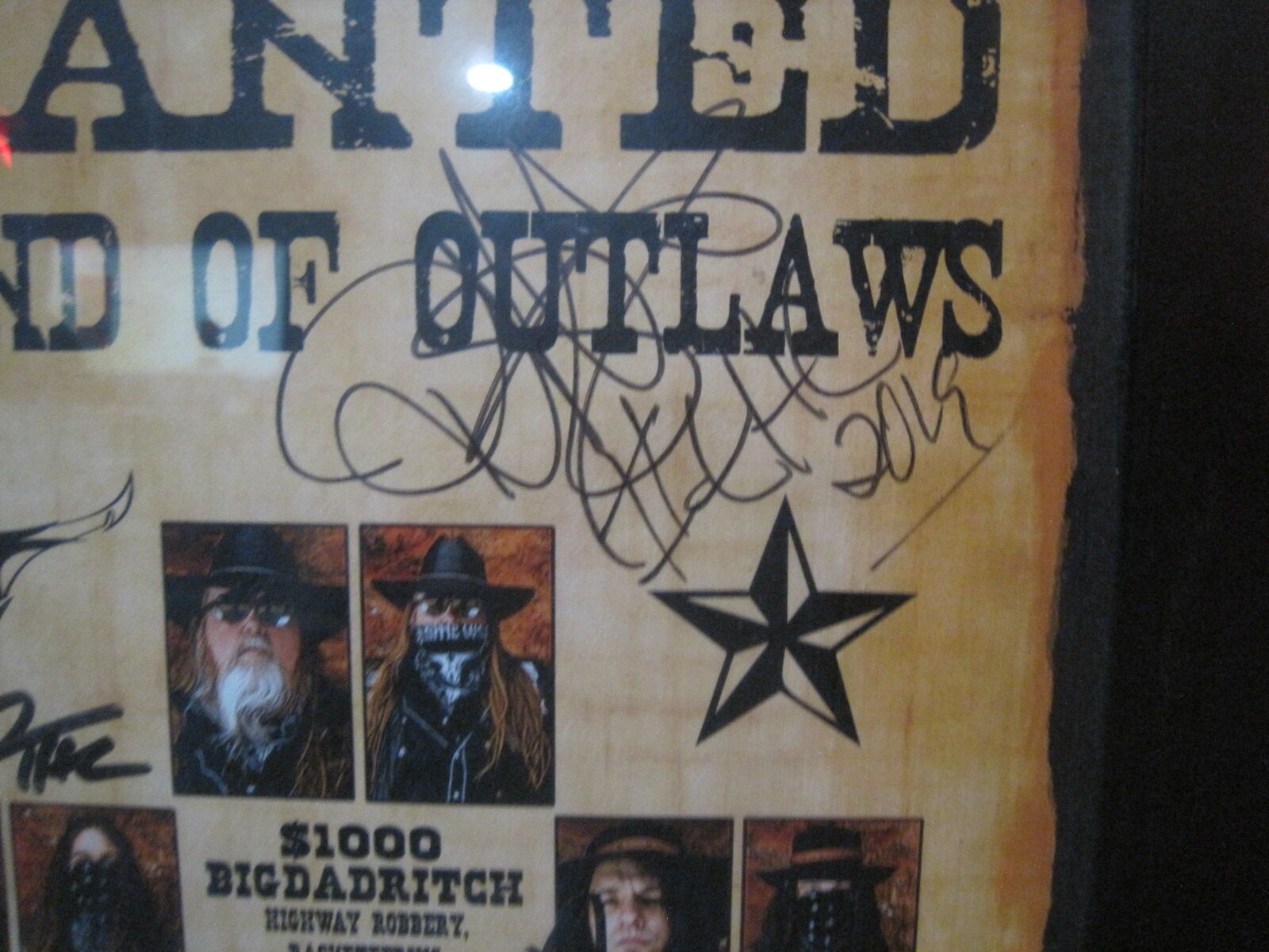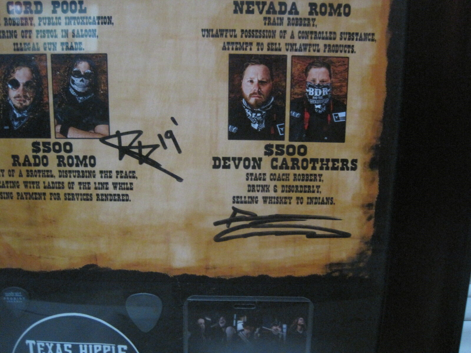 The Texas Hippie Coalition Band Autographed Wanted Poster is a rare and unique piece of music memorabilia. This poster features the signatures of the whole rock & pop band, making it a highly collectible item for fans of the genre. The package also includes a VIP pass, sticker, and two tabs, adding to the excitement of owning a piece of music history. This autographed poster is a must-have for any rock & pop music enthusiast looking to add a special item to their collection.