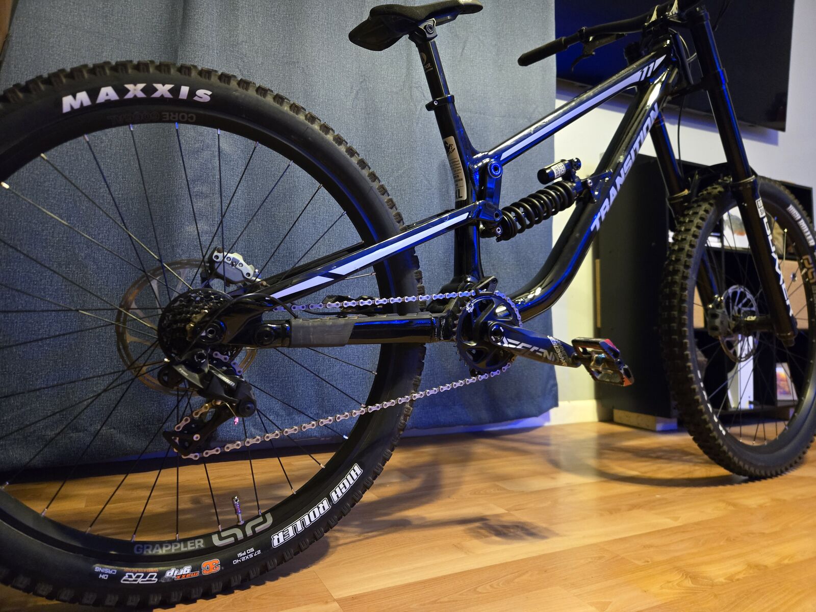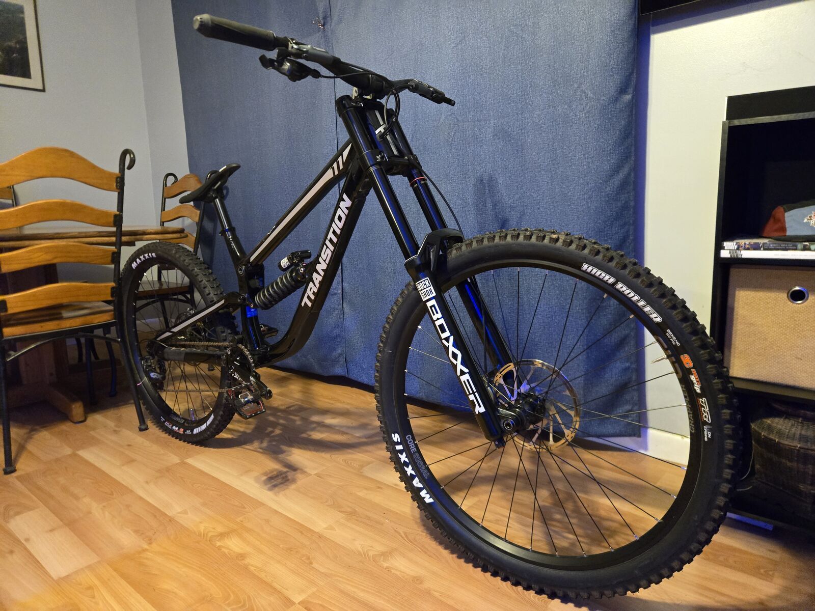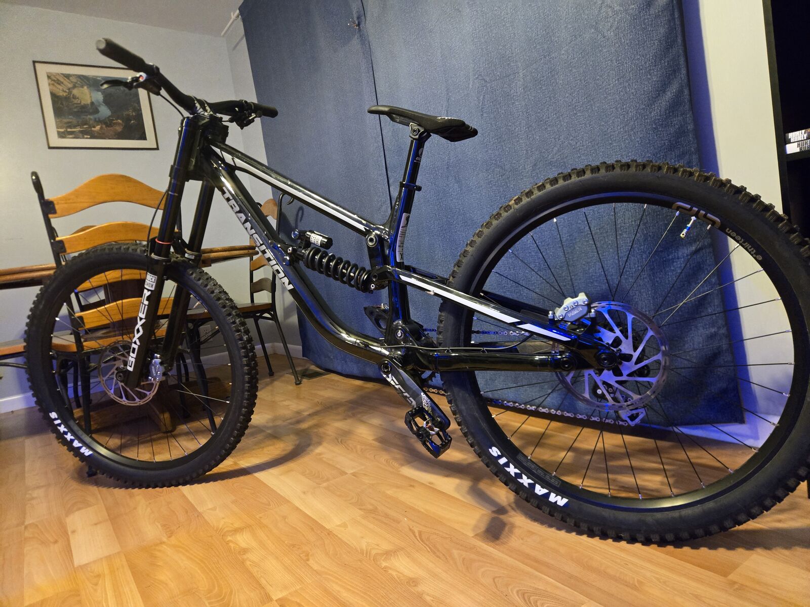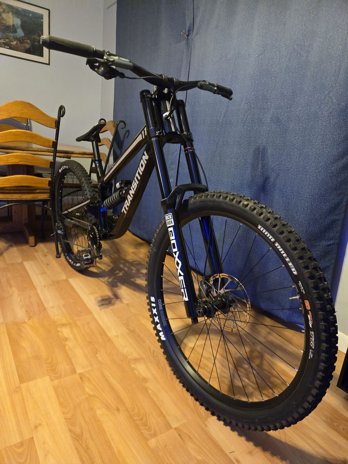 This TR11 (XL) is in excellent shape with only a few of the slight scratches on the frame. Mullet set-up for maximum fun in mind. Vivid in the rear and Boxxer up front with a GX drivetrain. Im a diehard TRP brake fan, but these Mavens definitely give them a run for the money if you haven’t tried em. I’ve only put 3 days of Fall riding on this bike- sadly, I need extensive knee surgery and will not be able to use a DH bike for a long time. As on the Transition website this is a $5k bike, so my loss can be your gain- go ahead take several hundred off the new price- I’ll even ship it to you free within the US. (Willing to ship to CA & MX too). Let me know if you have any questions!