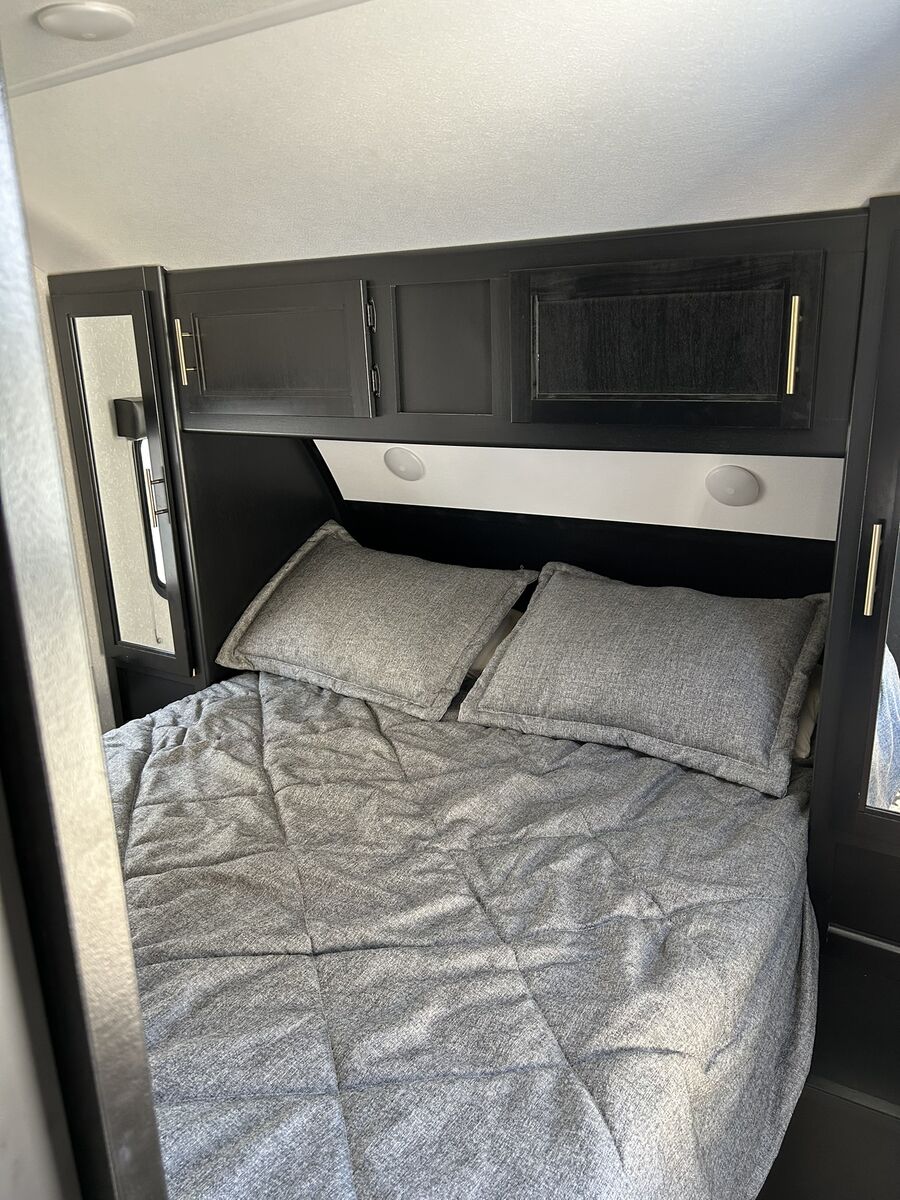 The Forest River Grey Wolf Limited 2022 26DBH is a great family-friendly travel trailer with a double bunk, double entry, and outdoor bathroom access. It boasts a modern kitchen with a large pantry and a U-shaped dinette. The exterior features an outdoor kitchen, speakers, and a TV bracket. It sleeps 10 and has a GVWR of 7,725 lbs. Only one owner and is in fantastic shape.