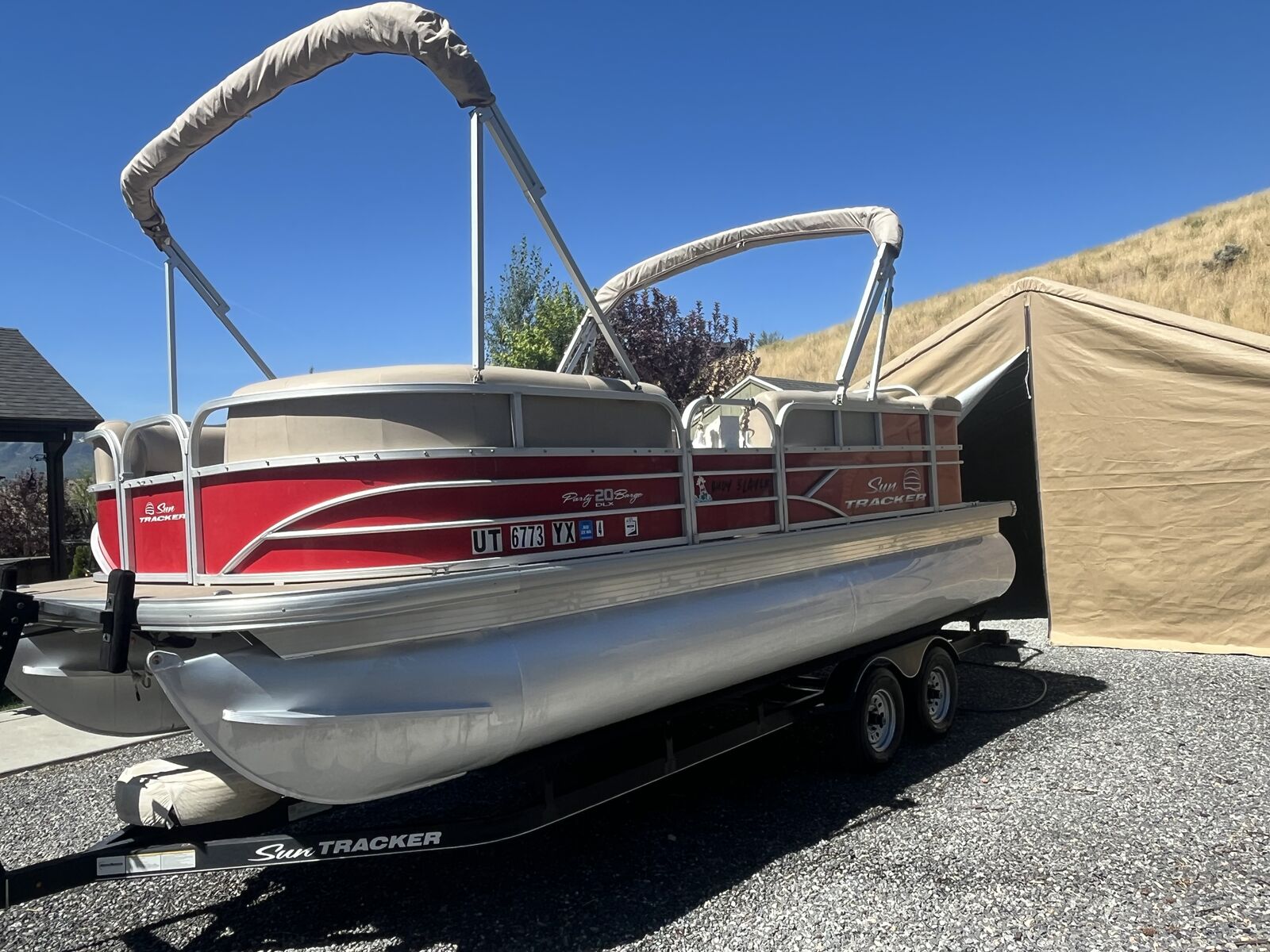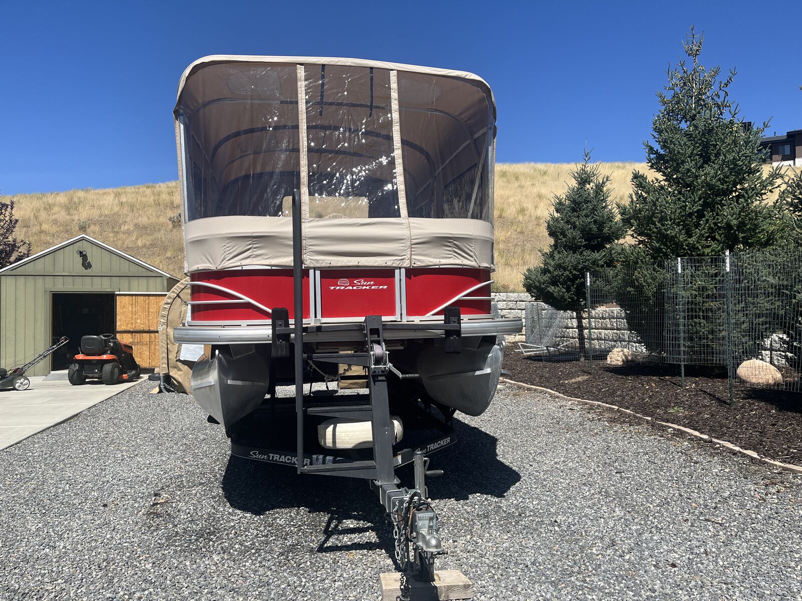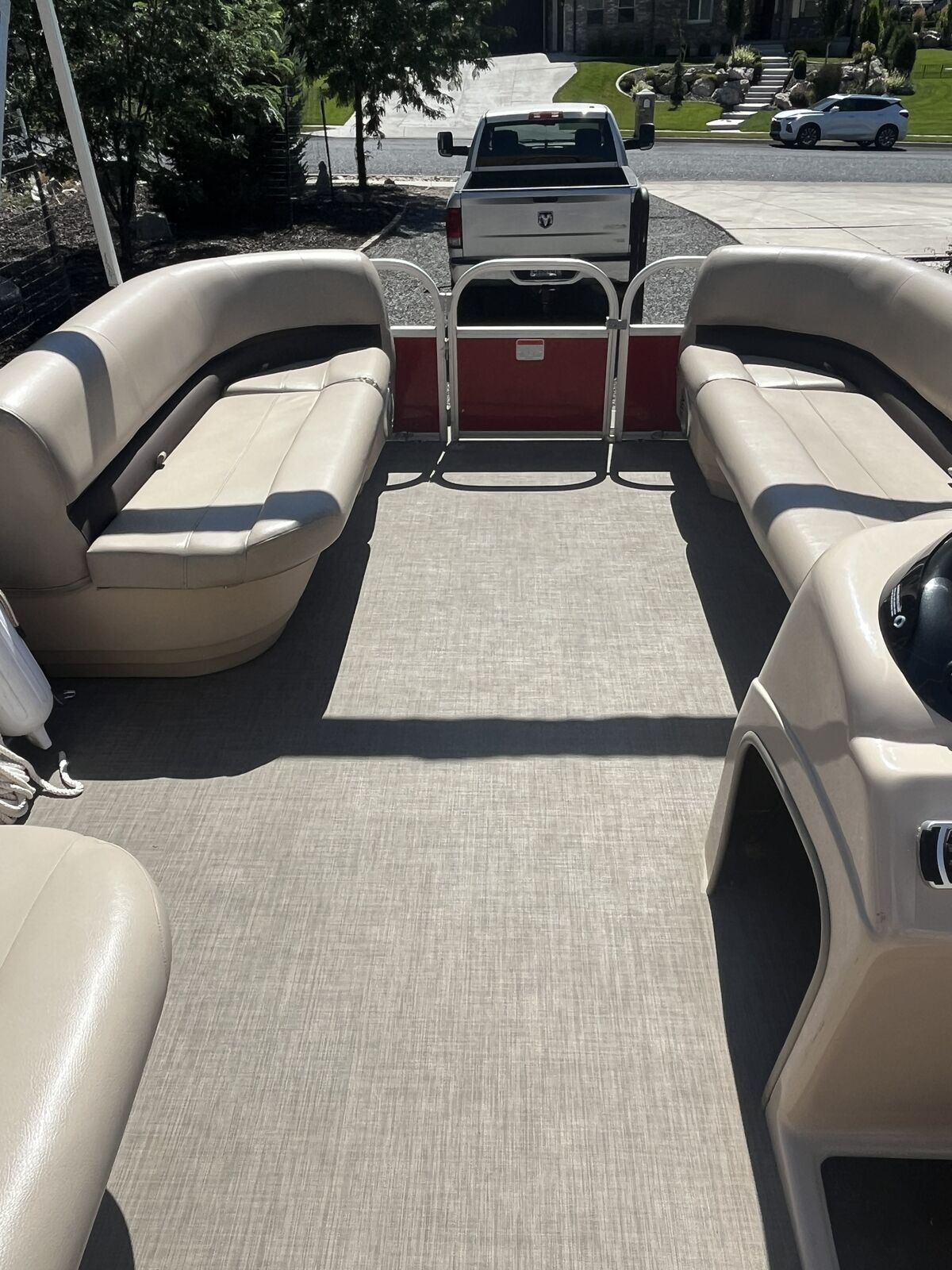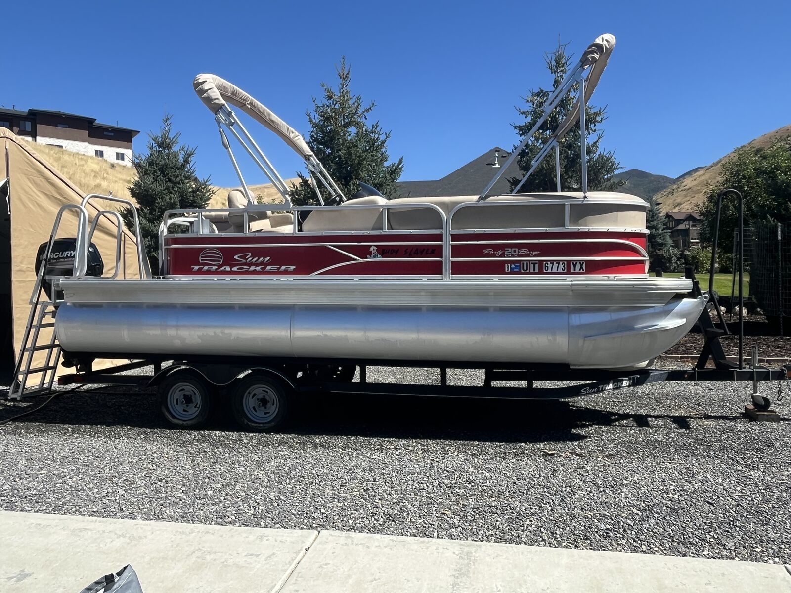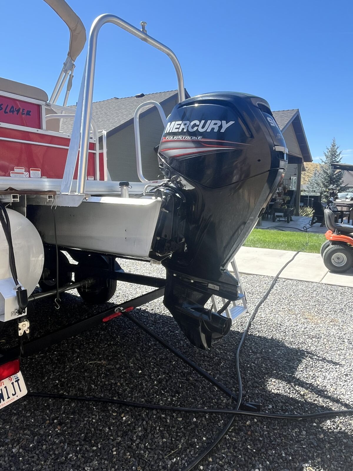 This pontoon boat has a 90 hp 4stroke mercury outboard motor. 175 hrs. Double Bimini. There is a custom travel cover. A full custom enclosure to keep weather or sleeping on the lake. custom ladder, also included two anchors with rope , two bumper floats, two life preservers, one air mattress, a grill
