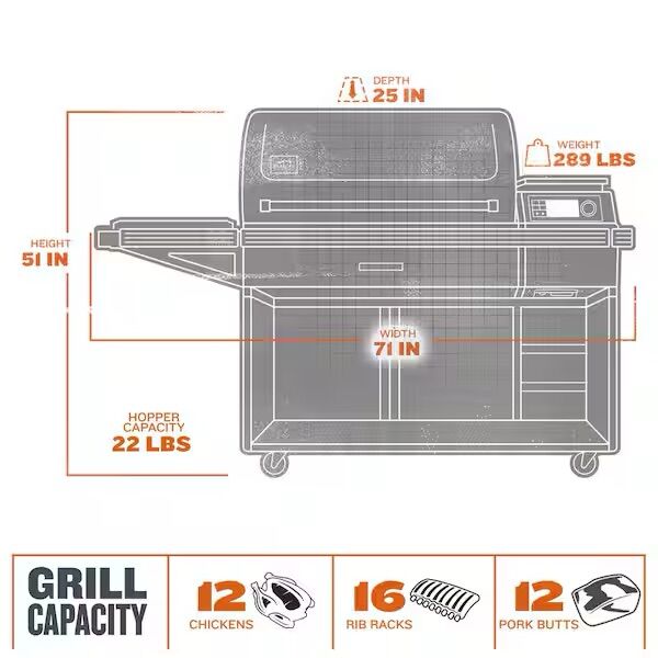 924 sq. in. total cooking space Full-color touchscreen controller WiFIRE technology control from anywhere with the Traeger app Super Smoke mode for enhanced wood-fired flavor Fully insulated for consistent temps and efficiency Pellet sensor + pellet dump for easy fuel management EZ-Clean grease & ash keg Downdraft exhaust for better smoke absorption Includes 2 wired meat thermometers Compatible with P.A.L. & ModiFIRE accessories