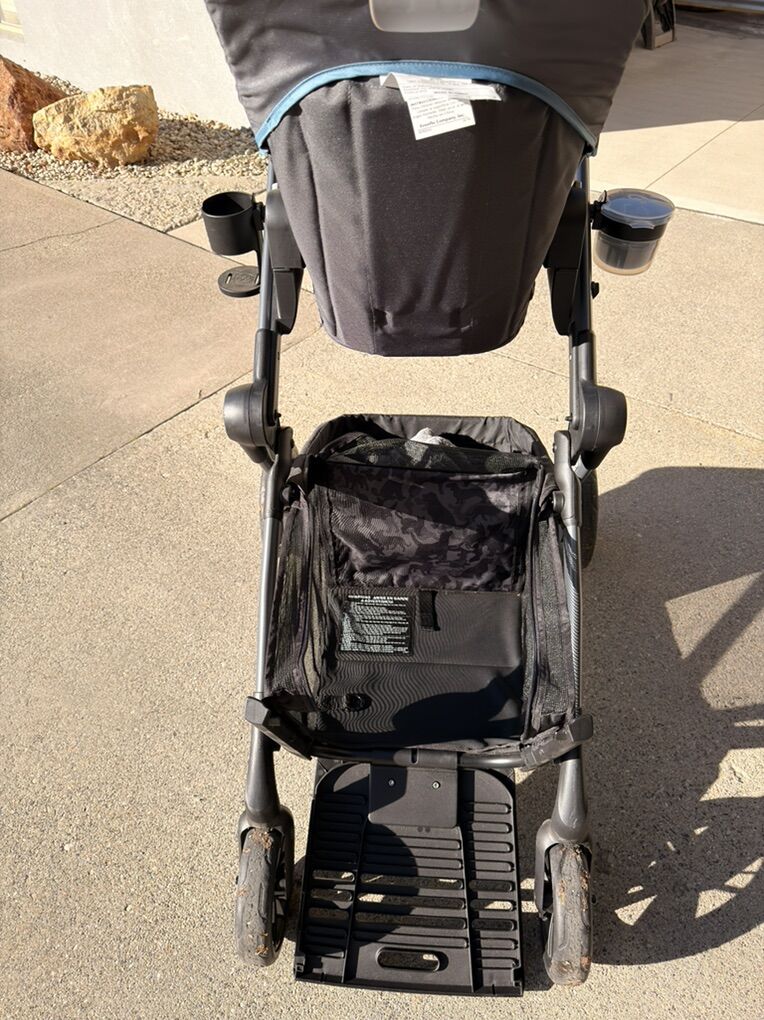 Includes the snack tray with cup holder for baby, snack bowl and poop bag dispenser for pets, and cup holder for parents.