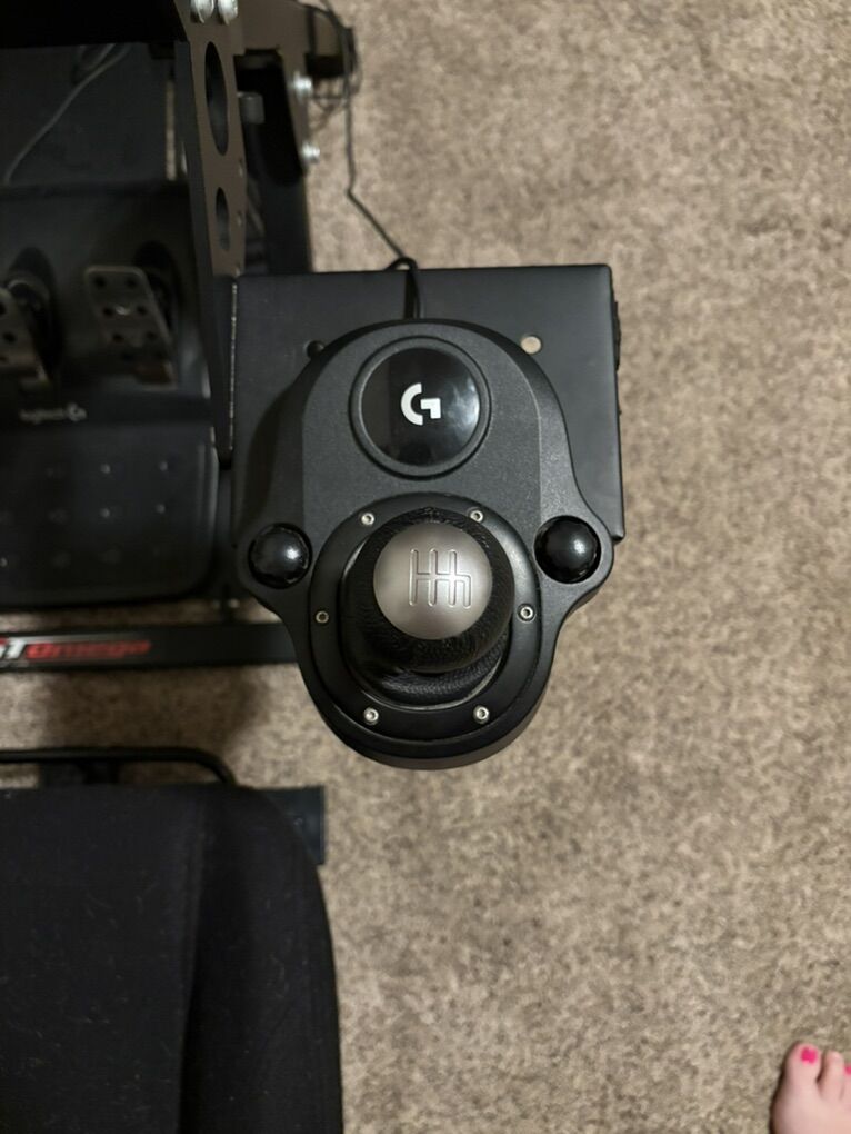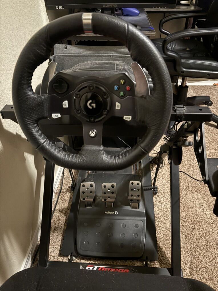 complete beginner sim racing setup. Includes the Logitech G920 wheel, pedals, and shifter. These will only work on Xbox consoles. All of these are mounted to a GT-Omega Apex fully adjustable stand. Height, depth, and angle of all components are adjustable, and the stand folds up for easier storage. The steering wheel has magnetic paddle shifters installed from GModUK. Also included is a magnetic H shifter from GModUK that I never got around to installing. As well as a M12x1.25 shift knob adapter. Also included is a 2 way adjustable seat from a different wheel stand.
