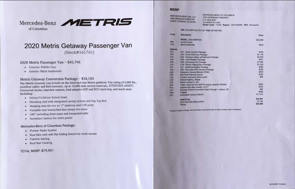 The 2020 MERCEDES-BENZ Metris Getaway is a versatile and reliable pop-up camper that is perfect for all your outdoor adventures. With a mileage of 70,000 miles, this camper is just getting broken in and ready for your next road trip. Garaged and mostly only used for weekend camping trips, this vehicle has been cared for and loved by two older travelers from Maine. It’s been a great car and hasn’t had any problems. Timely oil changes and maintenance.