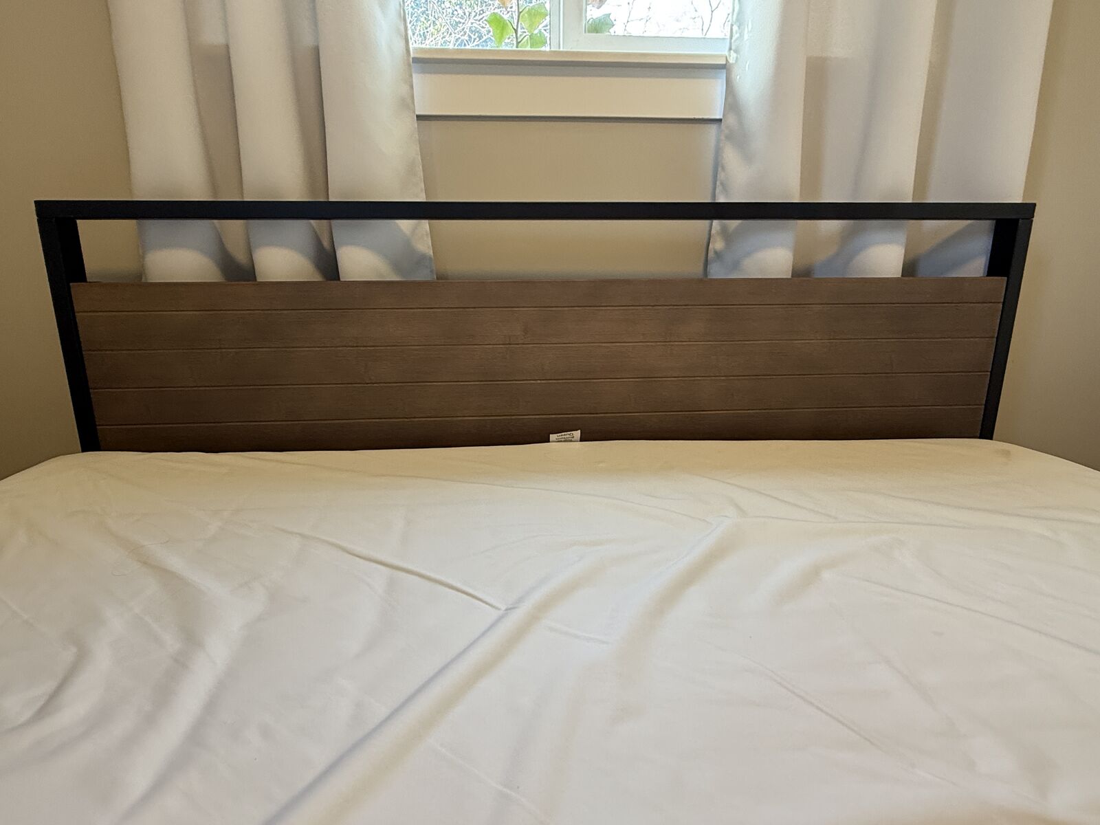 ZelleQueen sized modern metal and wood bed frame, mattress, and box springs for sale.