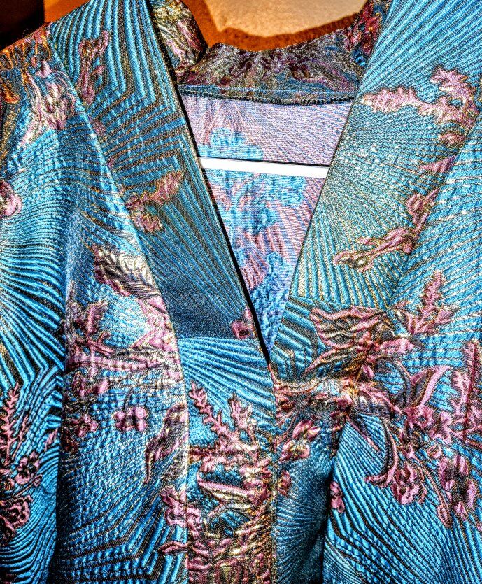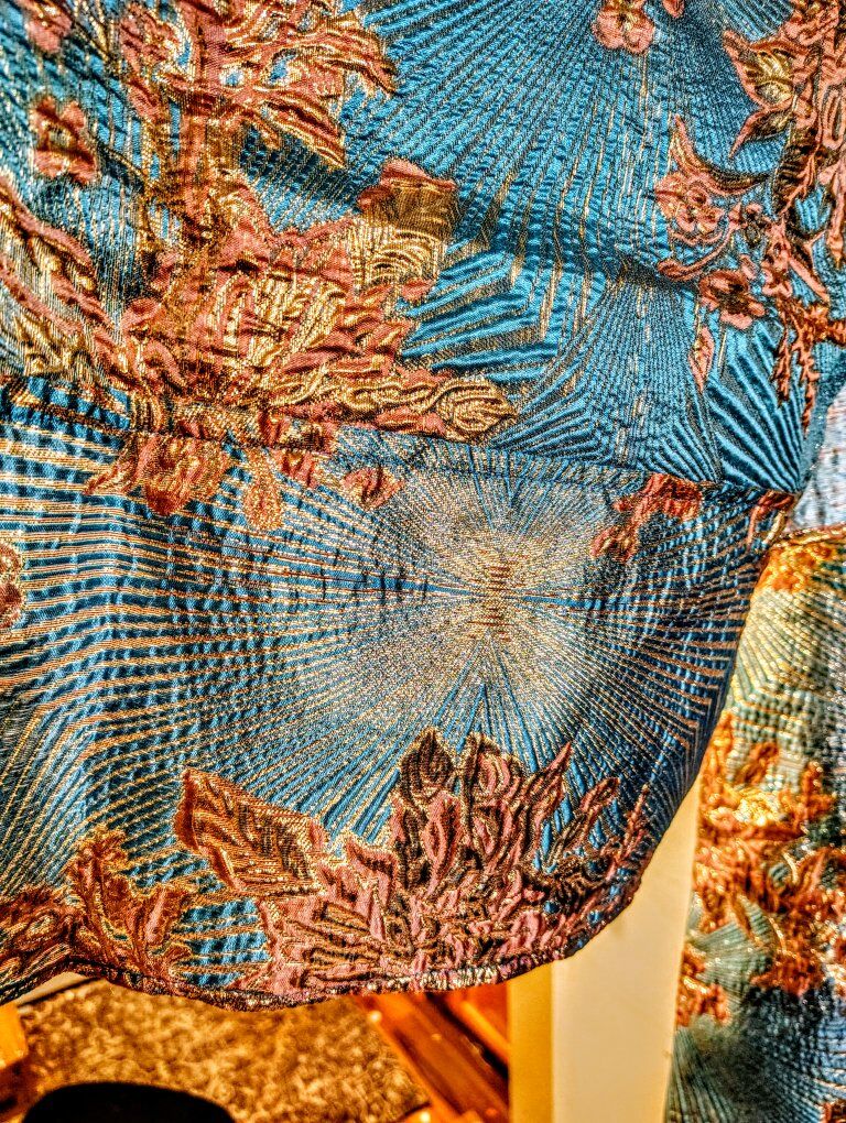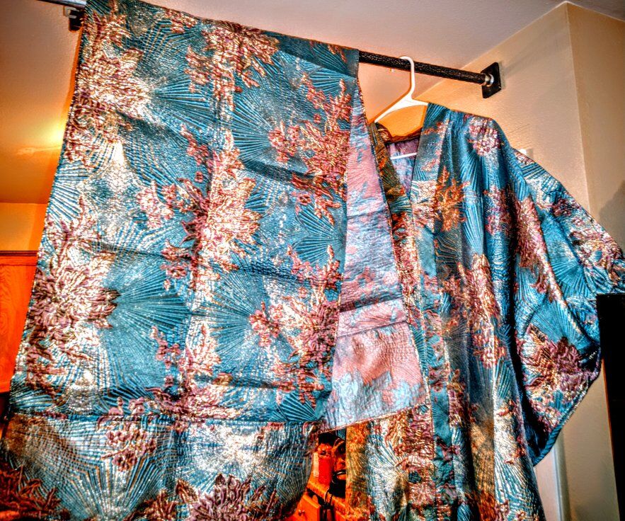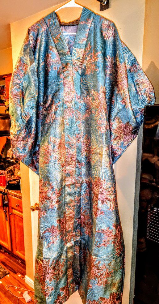 Stunning Teal & Copper Metallic Brocade Kimono Set (with Obi) Make a statement with this breathtaking, high-quality kimono set. This isn’t your average thin robe; it is crafted from a heavy, premium brocade fabric with an intricate floral and fan pattern that catches the light beautifully from every angle. Product Highlights: Exquisite Fabric: Vibrant teal base woven with shimmering gold and copper metallic threads for a rich, textured feel. Full Set: Includes the matching wide Obi (sash), making it a complete ensemble. Versatile: Perfect for formal events, high-end cosplay, or even as a luxury wall display/home decor piece. Condition: New/Excellent The colors are even more vibrant in person! Details: Size: One size fits most (traditional wrap style). Price: $125 Location: Salt Lake City This unique piece won't last long—the metallic detail is truly one-of-a-kind. First come, first served!