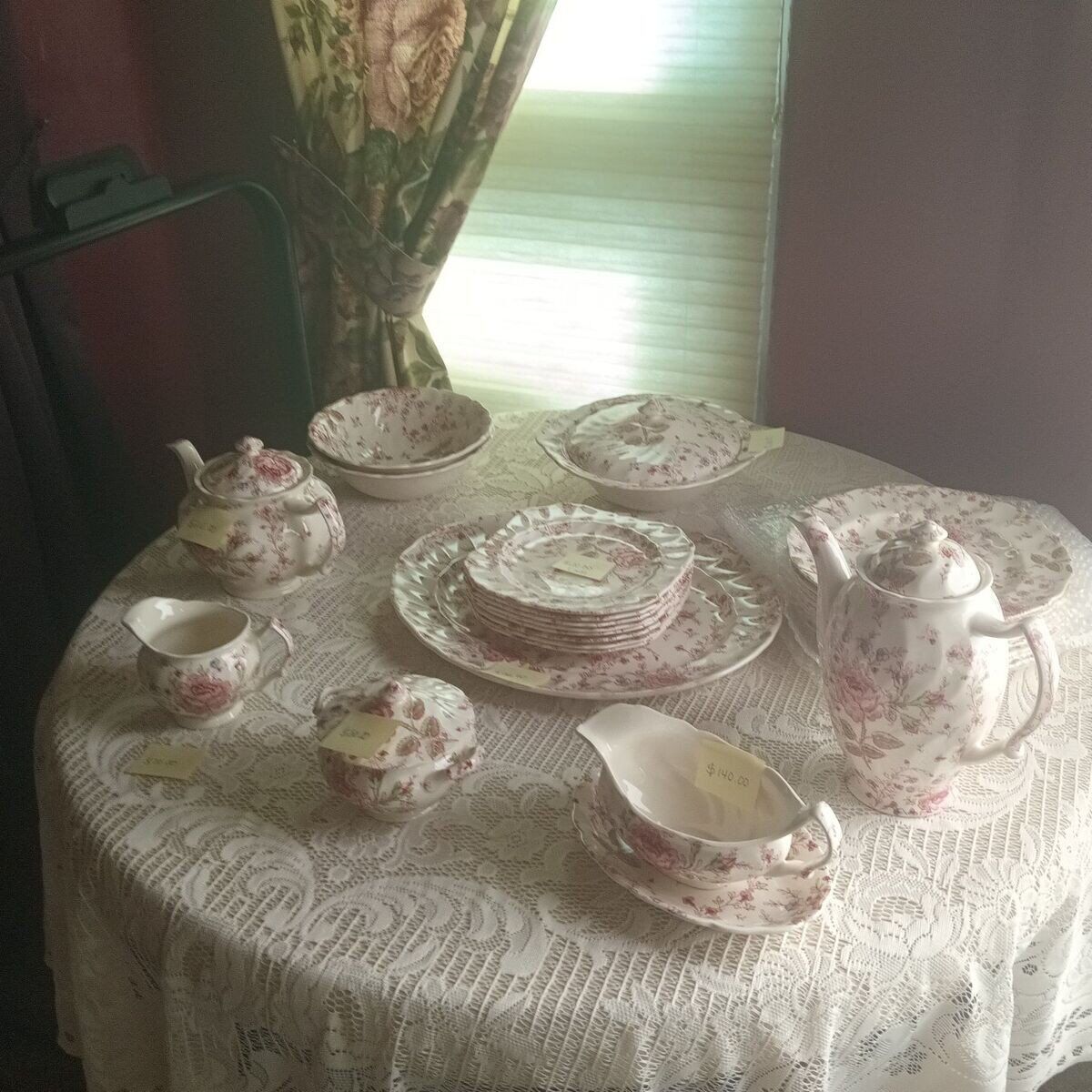 Rose Chintz-Pink by Johnson Brothers, I have a lot of different pieces such as teacups salad bowls sugar creamer gravy bowl and two different sizes of teapots I would love to sell this set of china piece by piece if you have any questions please contact me .Every peace is a different price depending on what your interested in only or the selection,used 2 times mint condition, there is no damage every piece has a (made in England) stamp.The price will be different, so I can't advertise a price 5.00-250.00