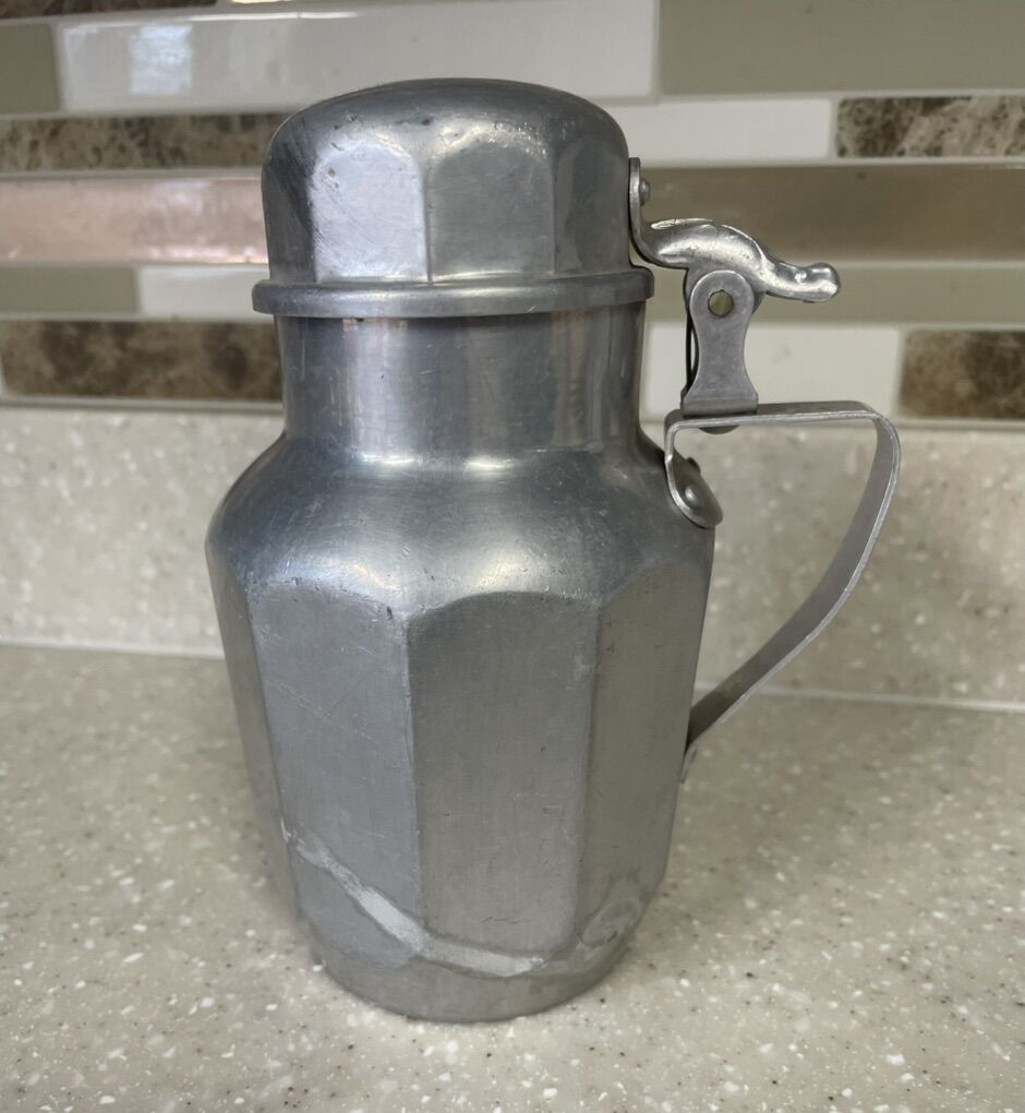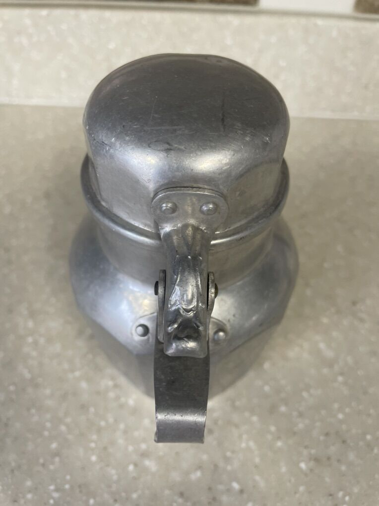 VenmoVintage Viko Syrup Aluminum Pitcher / Server with Lid, 5-3/4 Tall, 1920's. This is a vintage aluminum syrup pitcher, often associated with the Karo syrup brand or manufacturers like Viko, Mirro, or Signet. • Material: It is made of aluminum. • Design: The pitcher has a hinged, flip-top lid operated by a thumb push and a faceted, paneled body. • Era: These types of pitchers were popular in the 1920s to 1950s. • Function: They were used for serving and sometimes warming up syrup for pancakes or waffles.